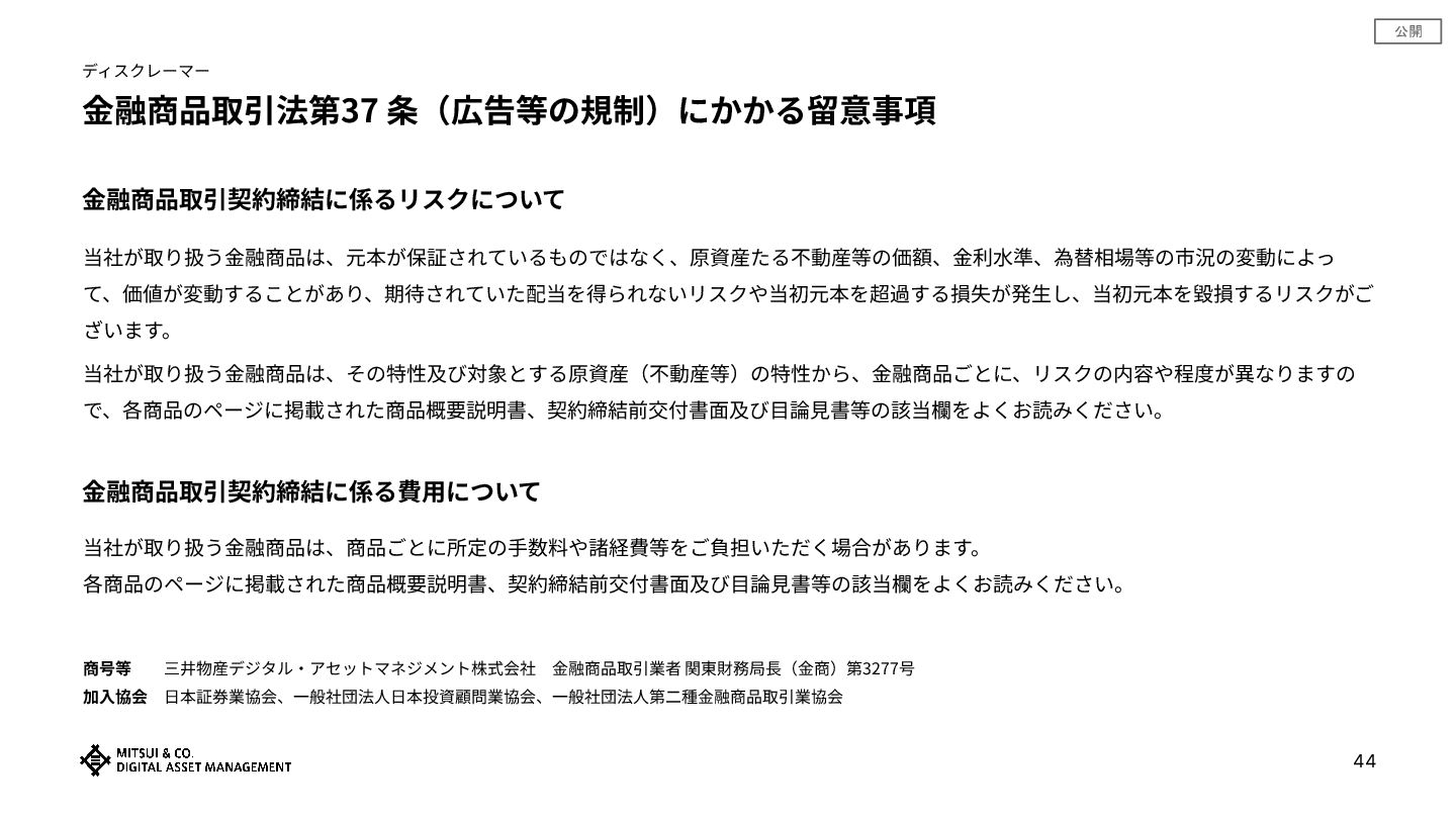 公開 44 ディスクレーマー ⾦融商品取引法第37 条(広告等の規制)にかかる留意事項 ⾦融商品取引契約締結に係るリスクについて 当社が取り扱う⾦融商品は、元本が保証されているものではなく、原資産たる不動産等の価額、⾦利⽔準、為替相場等の市況の変動によっ て、価値が変動することがあり、期待されていた配当を得られないリスクや当初元本を超過する損失が発⽣し、当初元本を毀損するリスクがご ざいます。 当社が取り扱う⾦融商品は、その特性及び対象とする原資産(不動産等)の特性から、⾦融商品ごとに、リスクの内容や程度が異なりますの
