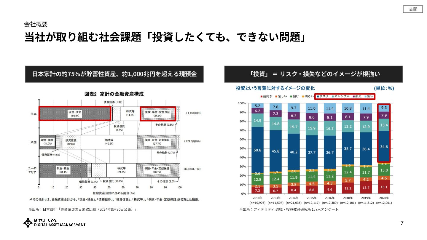 公開 当社が取り組む社会課題「投資したくても、できない問題」 会社概要 ⽇本家計の約75%が貯蓄性資産、約1,000兆円を超える現預⾦ ※出所:⽇本銀⾏「資⾦循環の⽇⽶欧⽐較(2024年8⽉30⽇公表)」 「投資」 = リスク‧損失などのイメージが根強い 7 ※出所:フィデリティ