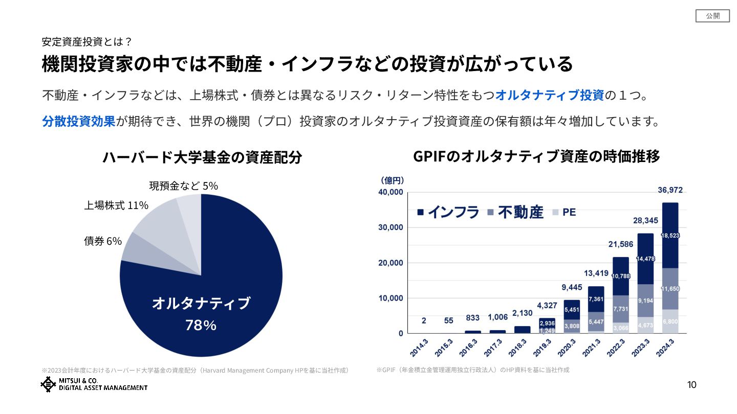 公開 機関投資家の中では不動産‧インフラなどの投資が広がっている 安定資産投資とは? 不動産‧インフラなどは、上場株式‧債券とは異なるリスク‧リターン特性をもつオルタナティブ投資の1つ。 分散投資効果が期待でき、世界の機関(プロ)投資家のオルタナティブ投資資産の保有額は年々増加しています。 GPIFのオルタナティブ資産の時価推移 ※GPIF(年⾦積⽴⾦管理運⽤独⽴⾏政法⼈)のHP資料を基に当社作成 (億円) ハーバード⼤学基⾦の資産配分 ※2023会計年度におけるハーバード⼤学基⾦の資産配分(Harvard