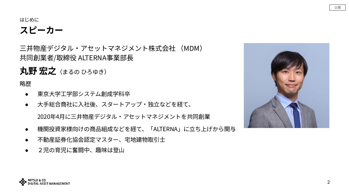 公開 はじめに スピーカー 三井物産デジタル‧アセットマネジメント株式会社 (MDM) 共同創業者/取締役 ALTERNA事業部⻑ 丸野 宏之(まるの ひろゆき)