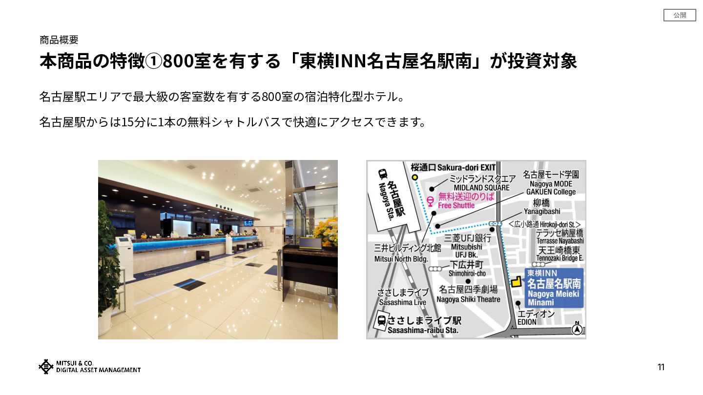 公開 商品概要 本商品の特徴①800室を有する「東横INN名古屋名駅南」が投資対象 11 名古屋駅エリアで最⼤級の客室数を有する800室の宿泊特化型ホテル。 名古屋駅からは15分に1本の無料シャトルバスで快適にアクセスできます。
