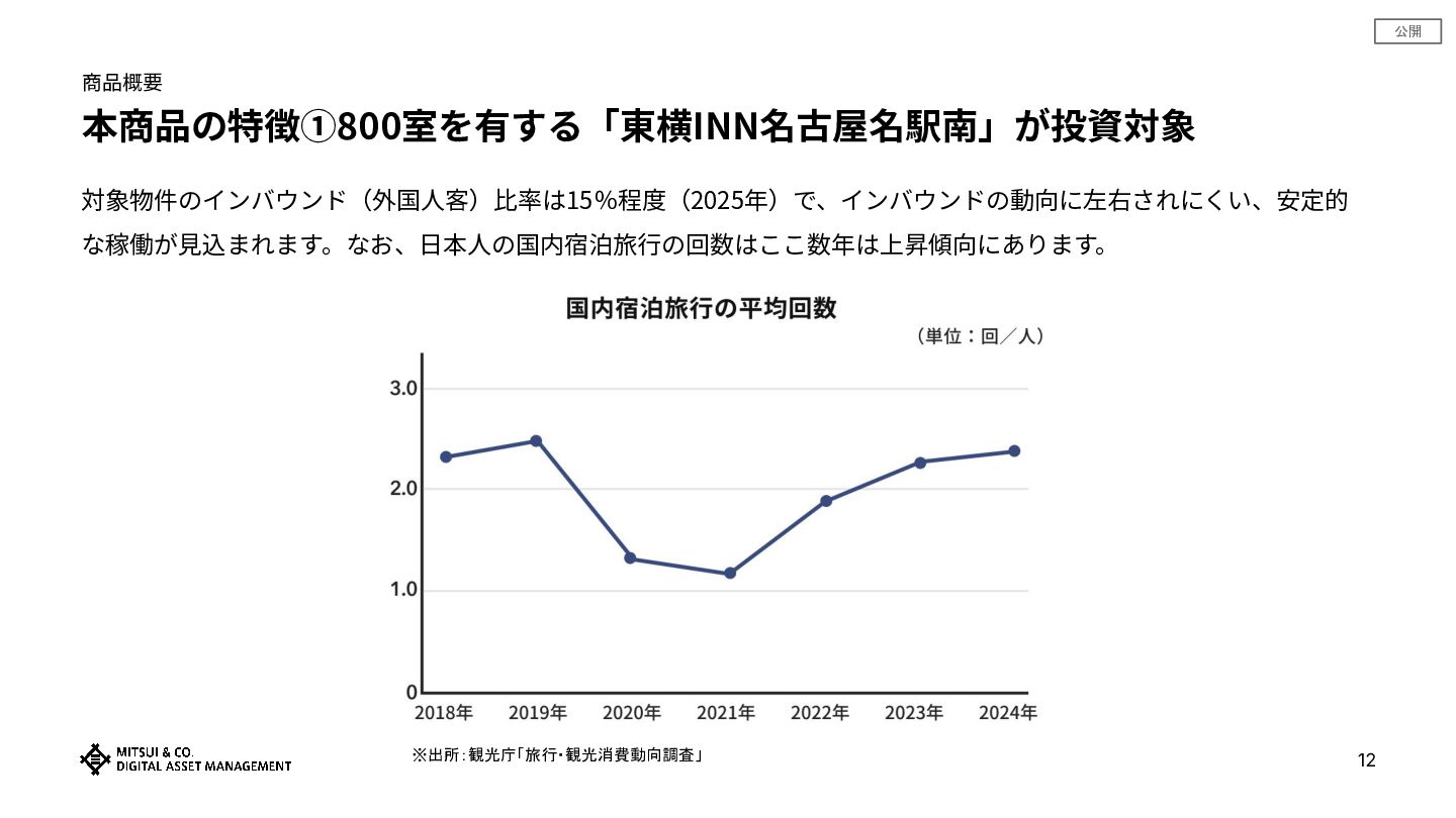 公開 商品概要 本商品の特徴①800室を有する「東横INN名古屋名駅南」が投資対象 12 対象物件のインバウンド(外国⼈客)⽐率は15%程度(2025年)で、インバウンドの動向に左右されにくい、安定的 な稼働が⾒込まれます。なお、⽇本⼈の国内宿泊旅⾏の回数はここ数年は上昇傾向にあります。 ※出所:観光庁「旅行・観光消費動向調査」