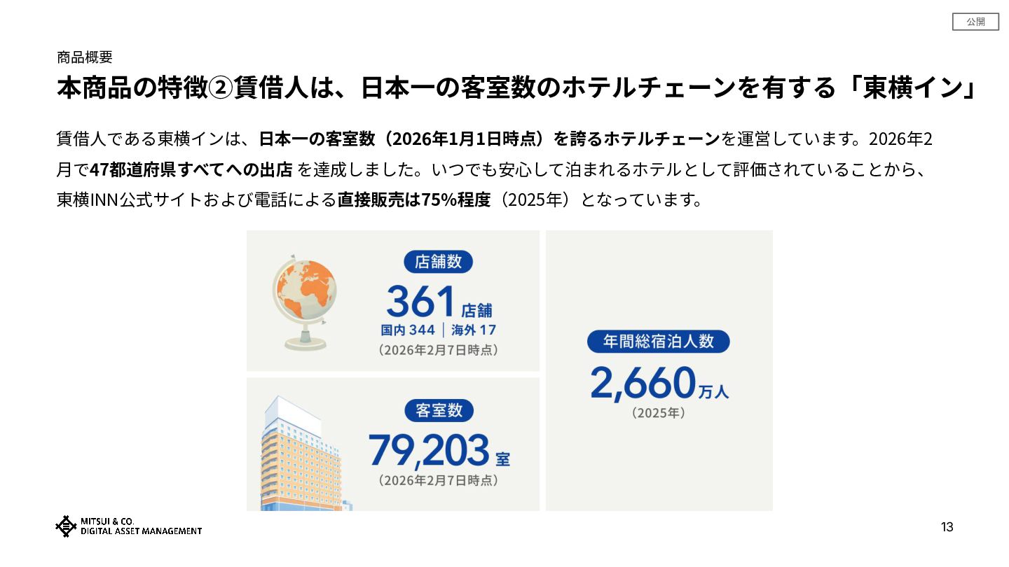 公開 商品概要 本商品の特徴②賃借⼈は、⽇本⼀の客室数のホテルチェーンを有する「東横イン」 13 賃借⼈である東横インは、⽇本⼀の客室数(2026年1⽉1⽇時点)を誇るホテルチェーンを運営しています。2026年2 ⽉で47都道府県すべてへの出店 を達成しました。いつでも安⼼して泊まれるホテルとして評価されていることから、 東横INN公式サイトおよび電話による直接販売は75%程度(2025年)となっています。