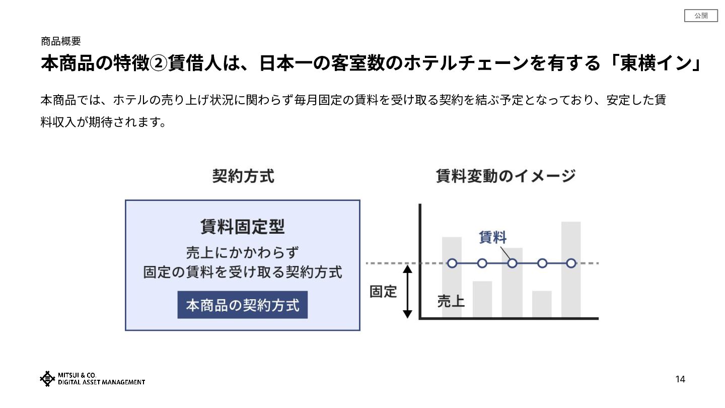 公開 商品概要 本商品の特徴②賃借⼈は、⽇本⼀の客室数のホテルチェーンを有する「東横イン」 14 本商品では、ホテルの売り上げ状況に関わらず毎⽉固定の賃料を受け取る契約を結ぶ予定となっており、安定した賃 料収⼊が期待されます。