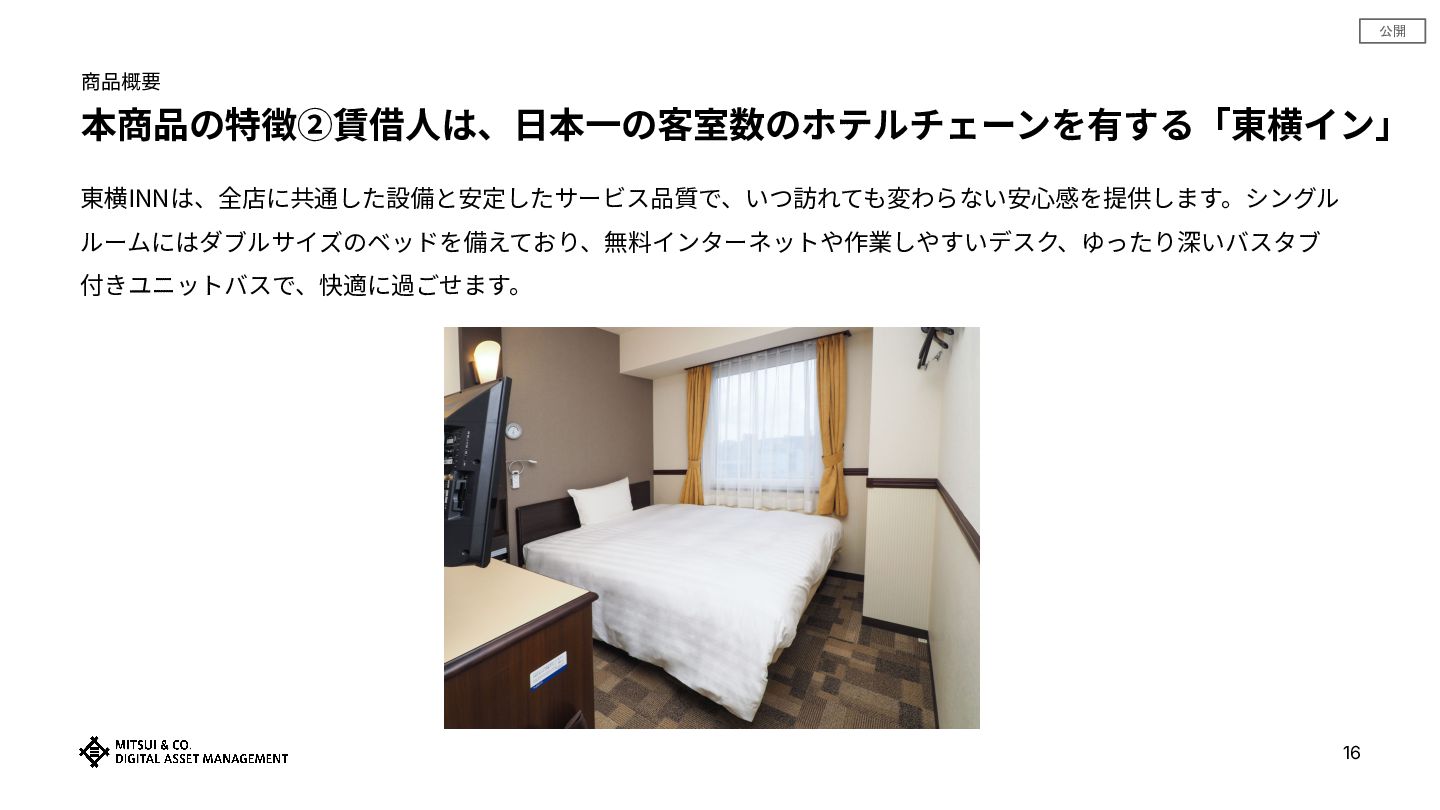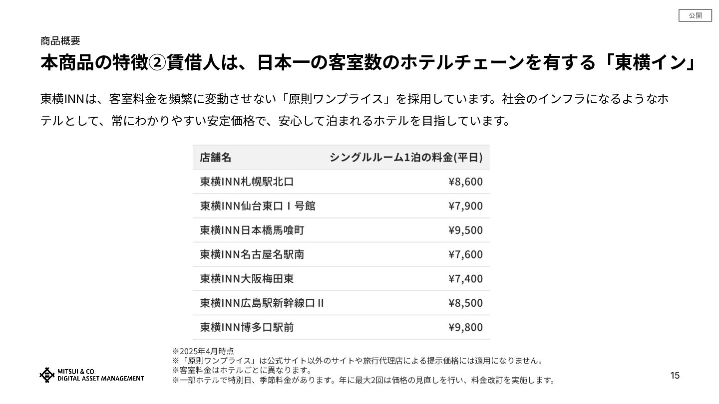 公開 商品概要 本商品の特徴②賃借⼈は、⽇本⼀の客室数のホテルチェーンを有する「東横イン」 15 東横INNは、客室料⾦を頻繁に変動させない「原則ワンプライス」を採⽤しています。社会のインフラになるようなホ テルとして、常にわかりやすい安定価格で、安⼼して泊まれるホテルを⽬指しています。 ※2025年4⽉時点 ※「原則ワンプライス」は公式サイト以外のサイトや旅⾏代理店による提⽰価格には適⽤になりません。 ※客室料⾦はホテルごとに異なります。 ※⼀部ホテルで特別⽇、季節料⾦があります。年に最⼤2回は価格の⾒直しを⾏い、料⾦改訂を実施します。