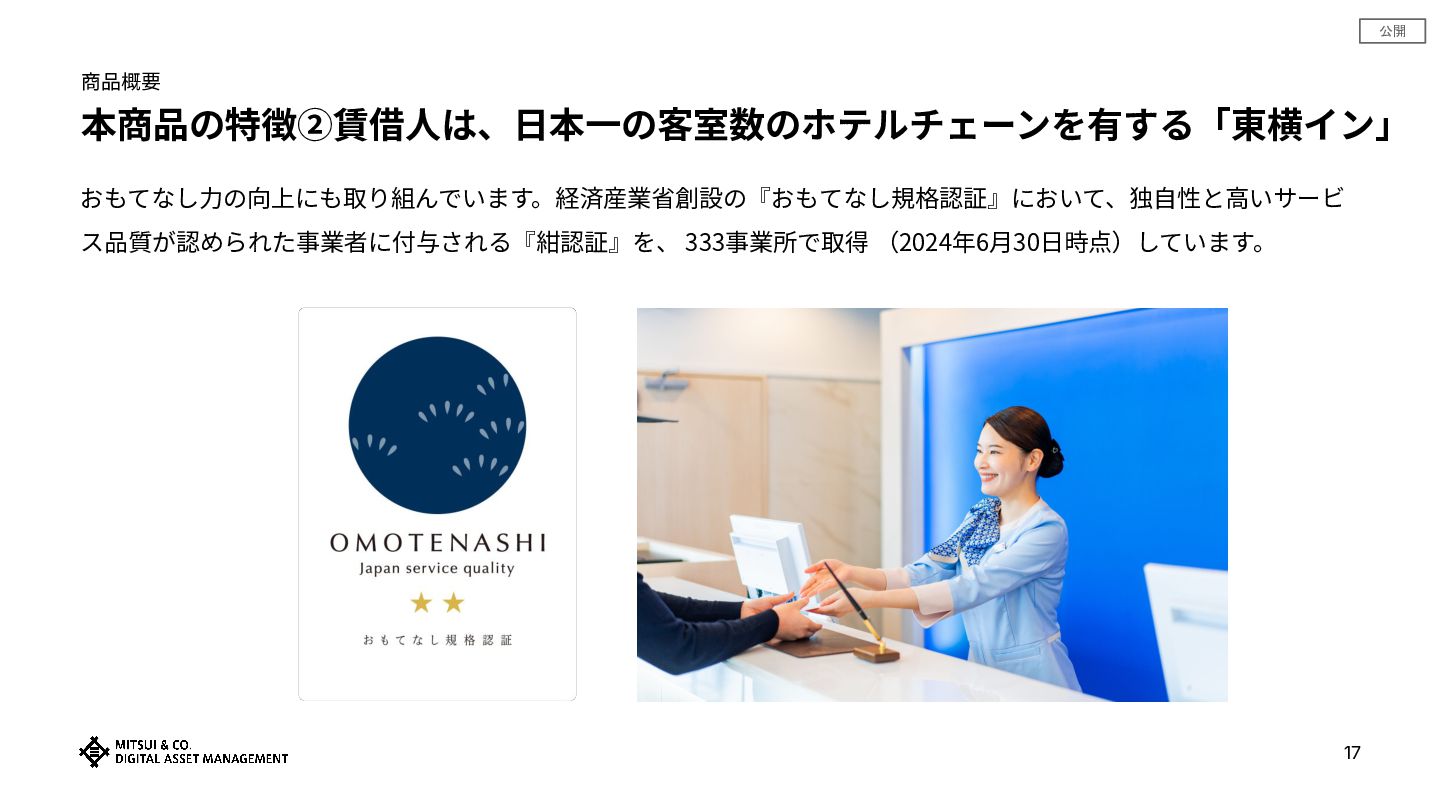 公開 商品概要 本商品の特徴②賃借⼈は、⽇本⼀の客室数のホテルチェーンを有する「東横イン」 17 おもてなし⼒の向上にも取り組んでいます。経済産業省創設の『おもてなし規格認証』において、独⾃性と⾼いサービ ス品質が認められた事業者に付与される『紺認証』を、 333事業所で取得 (2024年6⽉30⽇時点)しています。