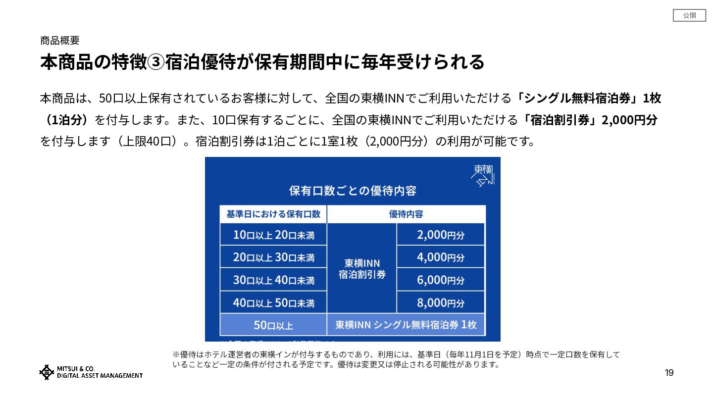 公開 商品概要 本商品の特徴③宿泊優待が保有期間中に毎年受けられる 19 本商品は、50⼝以上保有されているお客様に対して、全国の東横INNでご利⽤いただける「シングル無料宿泊券」1枚 (1泊分)を付与します。また、10⼝保有するごとに、全国の東横INNでご利⽤いただける「宿泊割引券」2,000円分 を付与します(上限40⼝)。宿泊割引券は1泊ごとに1室1枚(2,000円分)の利⽤が可能です。 ※優待はホテル運営者の東横インが付与するものであり、利⽤には、基準⽇(毎年11⽉1⽇を予定)時点で⼀定⼝数を保有して いることなど⼀定の条件が付される予定です。優待は変更⼜は停⽌される可能性があります。
