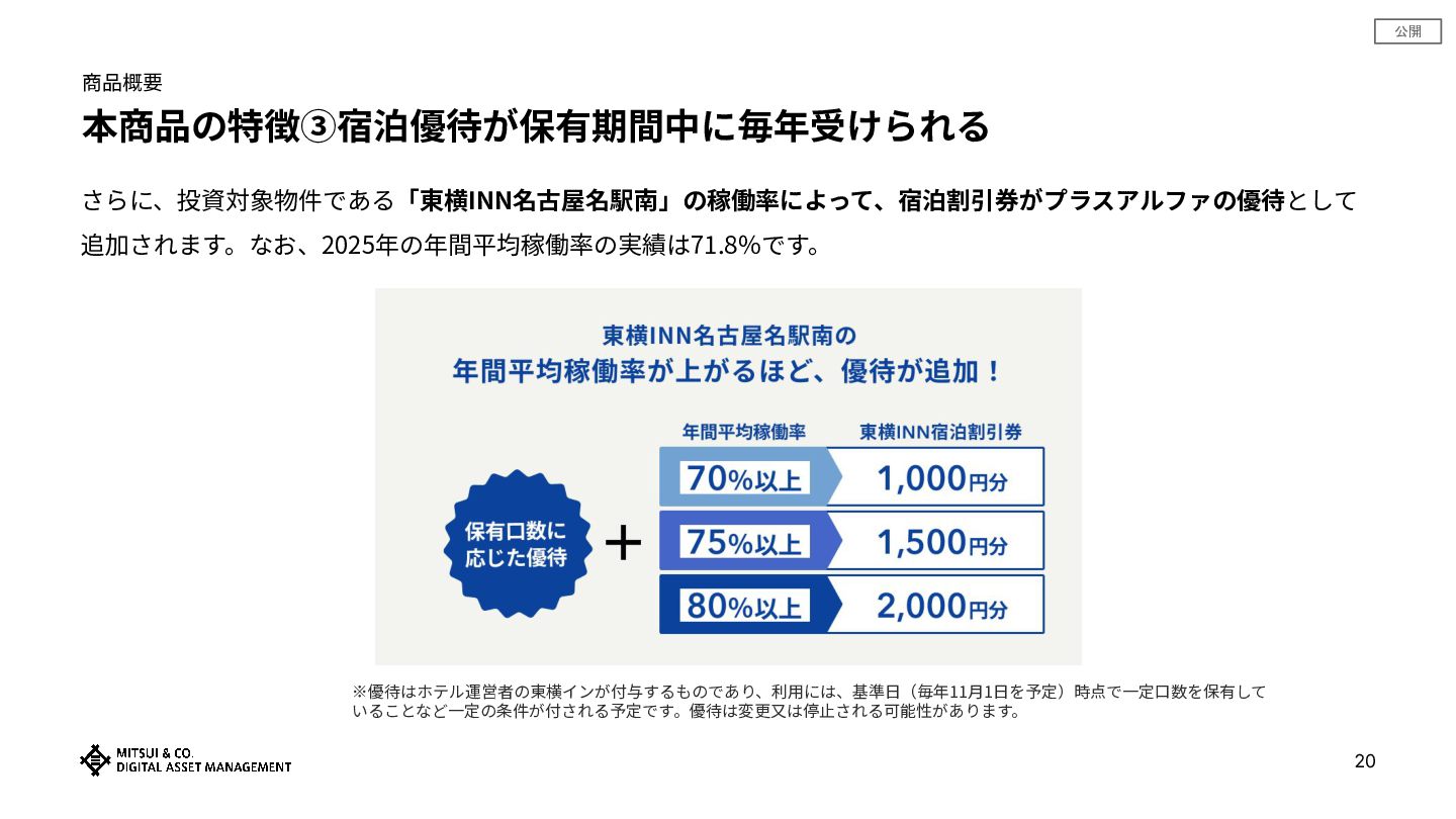 公開 商品概要 本商品の特徴③宿泊優待が保有期間中に毎年受けられる 20 さらに、投資対象物件である「東横INN名古屋名駅南」の稼働率によって、宿泊割引券がプラスアルファの優待として 追加されます。なお、2025年の年間平均稼働率の実績は71.8%です。 ※優待はホテル運営者の東横インが付与するものであり、利⽤には、基準⽇(毎年11⽉1⽇を予定)時点で⼀定⼝数を保有して いることなど⼀定の条件が付される予定です。優待は変更⼜は停⽌される可能性があります。