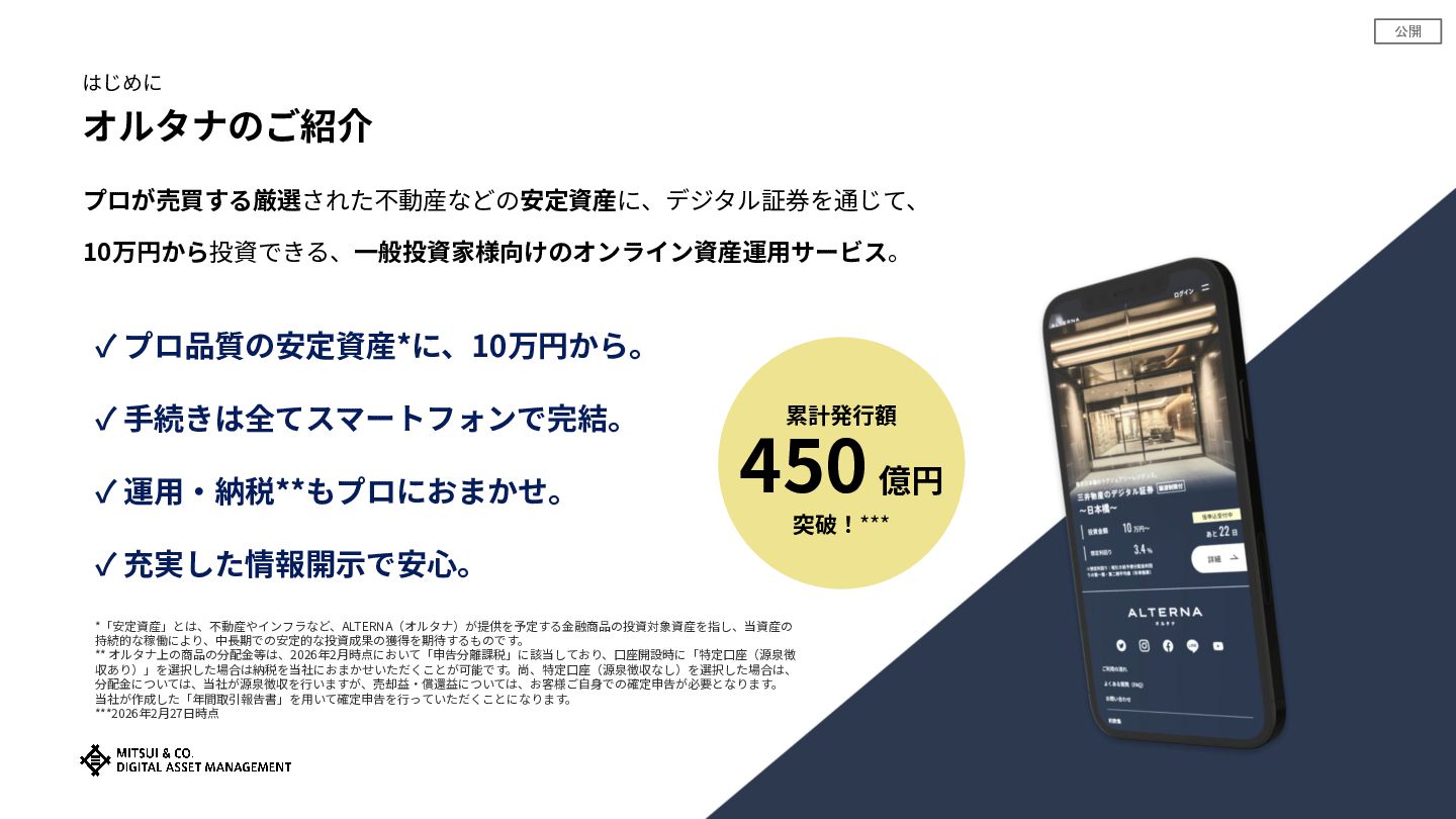 ✓ 運⽤‧納税**もプロにおまかせ。 ✓ 充実した情報開⽰で安⼼。 *「安定資産」とは、不動産やインフラなど、ALTERNA(オルタナ)が提供を予定する⾦融商品の投資対象資産を指し、当資産の 持続的な稼働により、中⻑期での安定的な投資成果の獲得を期待するものです。 ** オルタナ上の商品の分配⾦等は、2026年2⽉時点において「申告分離課税」に該当しており、⼝座開設時に「特定⼝座(源泉徴 収あり)」を選択した場合は納税を当社におまかせいただくことが可能です。尚、特定⼝座(源泉徴収なし)を選択した場合は、 分配⾦については、当社が源泉徴収を⾏いますが、売却益‧償還益については、お客様ご⾃⾝での確定申告が必要となります。 当社が作成した「年間取引報告書」を⽤いて確定申告を⾏っていただくことになります。 ***2026年2⽉27⽇時点 累計発⾏額 450 億円 突破!***