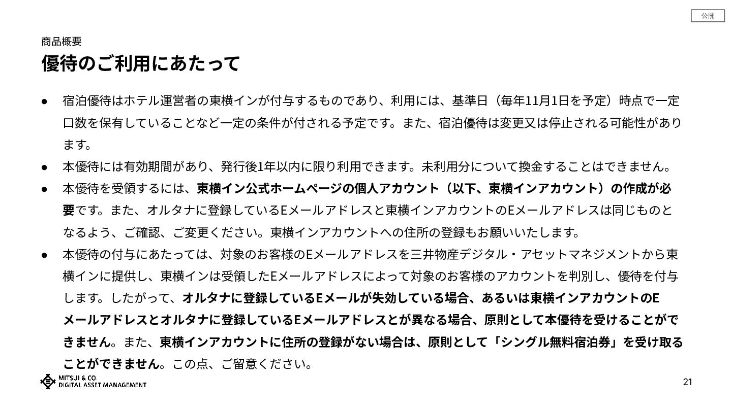 • 本優待を受領するには、東横イン公式ホームページの個⼈アカウント(以下、東横インアカウント)の作成が必 要です。また、オルタナに登録しているEメールアドレスと東横インアカウントのEメールアドレスは同じものと なるよう、ご確認、ご変更ください。東横インアカウントへの住所の登録もお願いいたします。 • 本優待の付与にあたっては、対象のお客様のEメールアドレスを三井物産デジタル‧アセットマネジメントから東 横インに提供し、東横インは受領したEメールアドレスによって対象のお客様のアカウントを判別し、優待を付与 します。したがって、オルタナに登録しているEメールが失効している場合、あるいは東横インアカウントのE メールアドレスとオルタナに登録しているEメールアドレスとが異なる場合、原則として本優待を受けることがで きません。また、東横インアカウントに住所の登録がない場合は、原則として「シングル無料宿泊券」を受け取る ことができません。この点、ご留意ください。