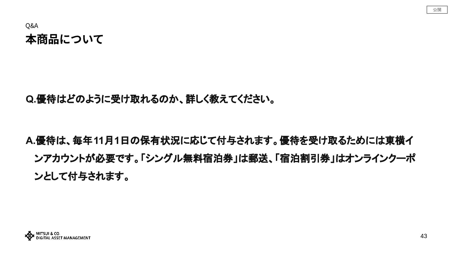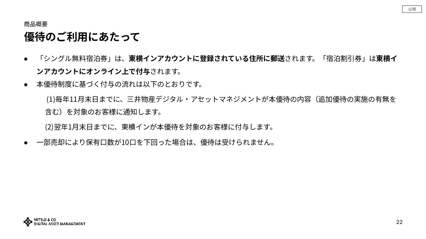 公開 商品概要 優待のご利⽤にあたって 22 • 「シングル無料宿泊券」は、東横インアカウントに登録されている住所に郵送されます。「宿泊割引券」は東横イ ンアカウントにオンライン上で付与されます。 • 本優待制度に基づく付与の流れは以下のとおりです。 (1)毎年11⽉末⽇までに、三井物産デジタル‧アセットマネジメントが本優待の内容(追加優待の実施の有無を