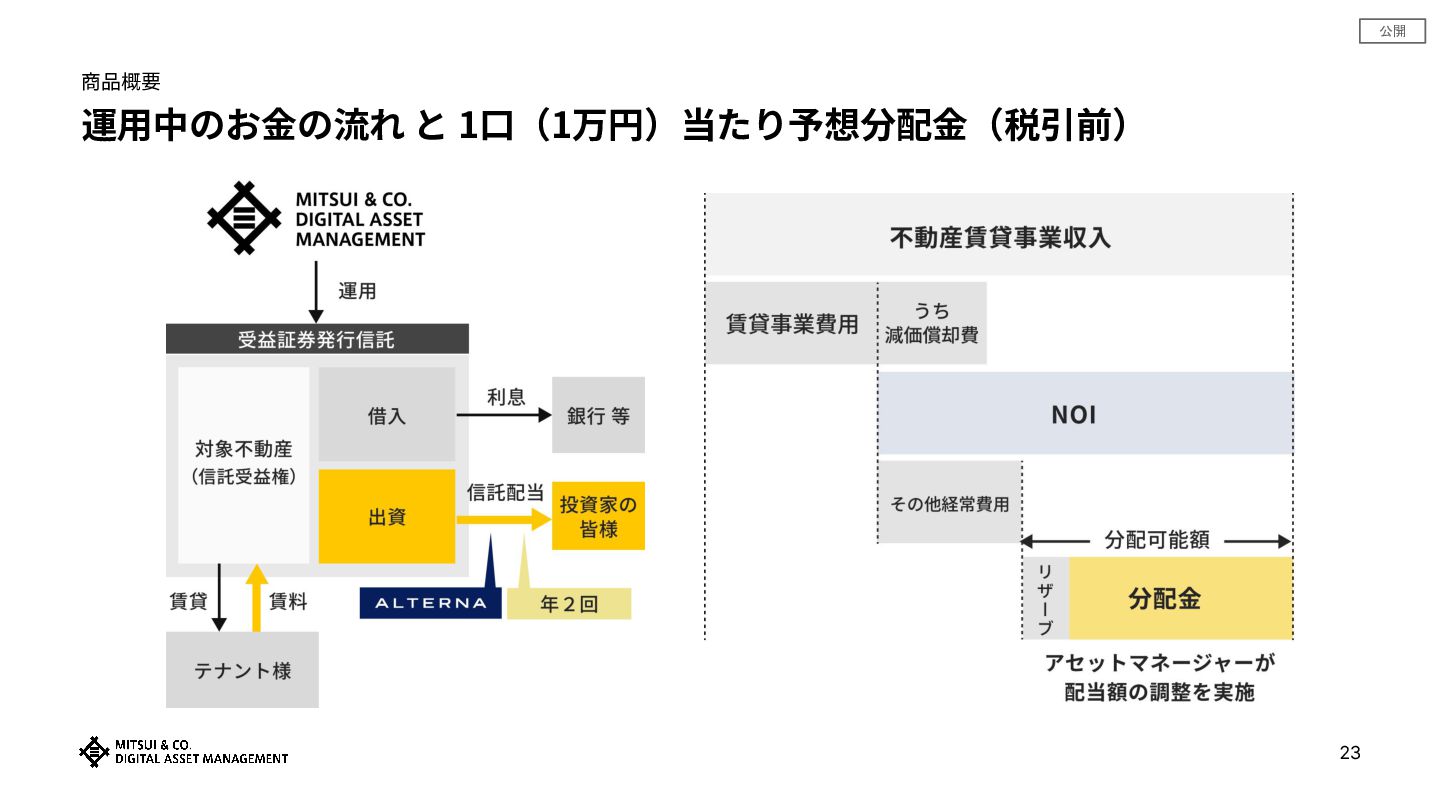 公開 商品概要 運⽤中のお⾦の流れ と 1⼝(1万円)当たり予想分配⾦(税引前) 23