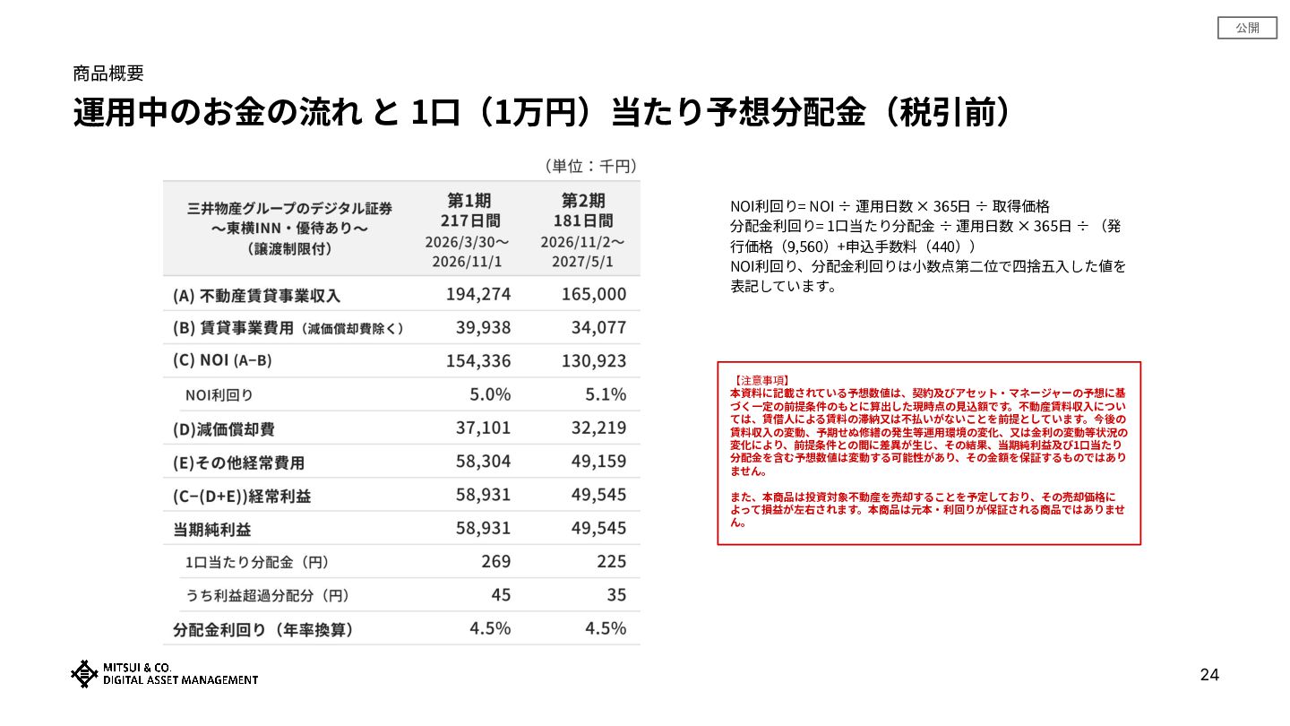 365⽇ ÷ 取得価格 分配⾦利回り= 1⼝当たり分配⾦ ÷ 運⽤⽇数 × 365⽇ ÷ (発 ⾏価格(9,560)+申込⼿数料(440)) NOI利回り、分配⾦利回りは⼩数点第⼆位で四捨五⼊した値を 表記しています。 【注意事項】 本資料に記載されている予想数値は、契約及びアセット‧マネージャーの予想に基 づく⼀定の前提条件のもとに算出した現時点の⾒込額です。不動産賃料収⼊につい ては、賃借⼈による賃料の滞納⼜は不払いがないことを前提としています。今後の 賃料収⼊の変動、予期せぬ修繕の発⽣等運⽤環境の変化、⼜は⾦利の変動等状況の 変化により、前提条件との間に差異が⽣じ、その結果、当期純利益及び1⼝当たり 分配⾦を含む予想数値は変動する可能性があり、その⾦額を保証するものではあり ません。 また、本商品は投資対象不動産を売却することを予定しており、その売却価格に よって損益が左右されます。本商品は元本‧利回りが保証される商品ではありませ ん。 24