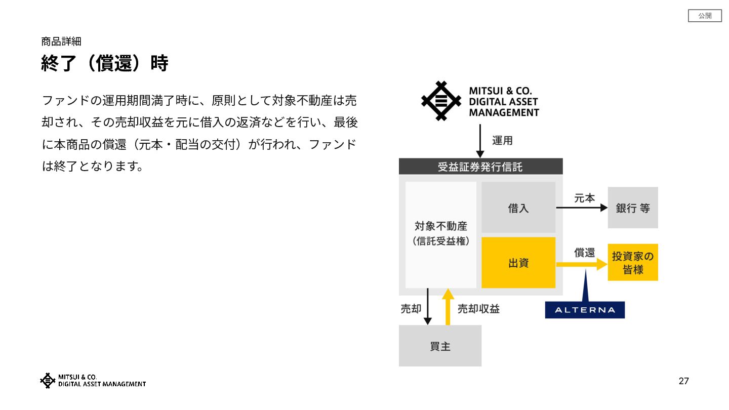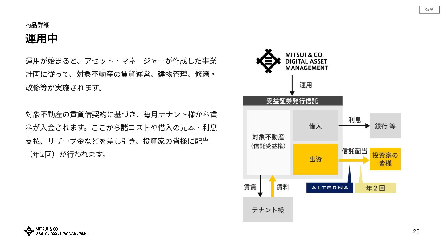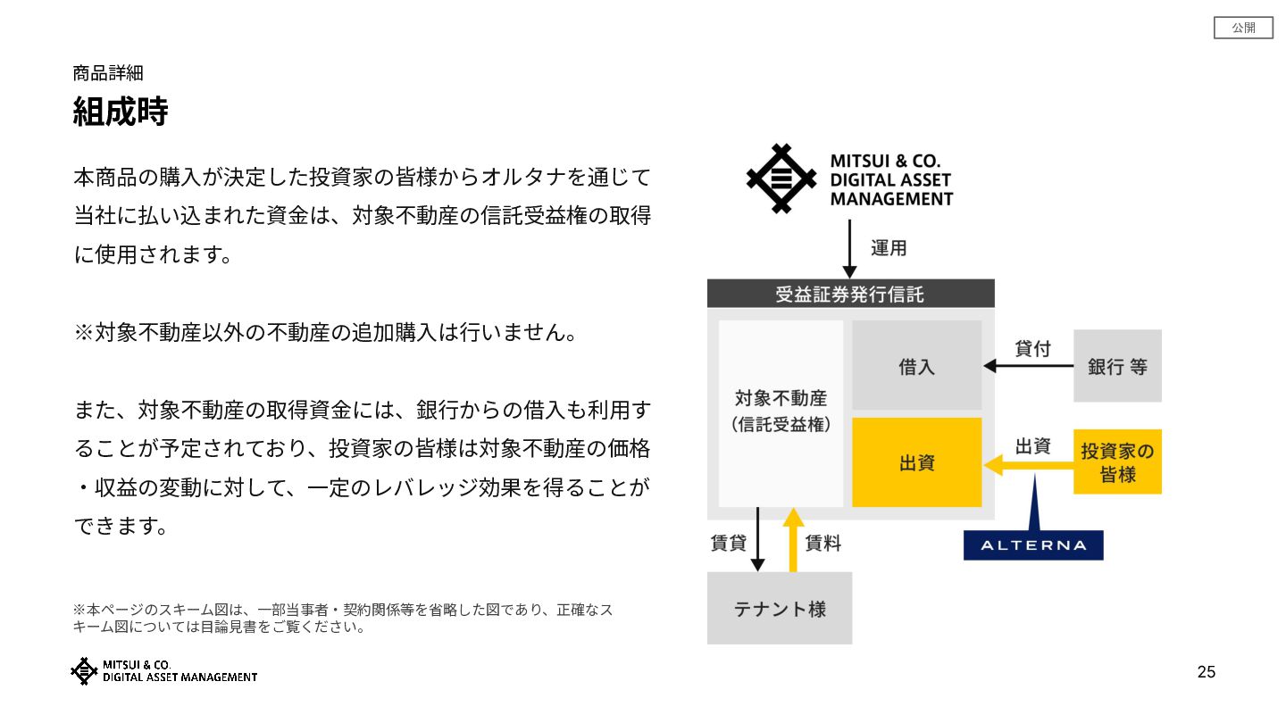 • 提供情報‧内容の数値等は、過去の実績値、概算値または計算値であり、実際とは異なる場合があります。また、予告なしに内容が 変更⼜は廃⽌される場合があります。 • 提供情報は、当社が著作権を有しますので、提供されましたお客さま限りでご使⽤ください。当社の事前承諾なしにこれを複製し、 改変し、刊⾏し、配布し、転⽤し、若しくは掲載すること及びこれを商業的に利⽤することを禁⽌します。また、本資料に掲載されている当社に関連 する商標類(商標、ロゴ及びサービスマーク)は、当社に属するものであり、 これを当社に無断で複製し、改変し、刊⾏し、配布し、転⽤し、若し くは転載すること及びこれを商業的に利⽤することを禁⽌します。 • 提供情報‧内容の投資対象物件等については、例⽰として掲載しているものですので、将来の取得‧成果等を⽰唆ないし保証するものではありませ ん。 • 本資料は、お客さまに対して税⾦、会計⼜は法律上のアドバイスを提供するものではありません。また、⽇本の居住者が利⽤するために作成されたも のであり、その他の国の居住者を対象とするものではありません。 • 投資に関する最終決定は、お客様向け資料等をよくお読みになり、お客様ご⾃⾝の判断でなさるようお願いします。 • 「安定資産」とは、不動産やインフラなど、ALTERNA(オルタナ)が提供を予定する⾦融商品の投資対象資産を指し、当資産の持続的な稼働によ り、中⻑期での安定的な投資成果の獲得を期待するものです。なおALTERNA(オルタナ)が提供する⾦融商品は元本保証や将来の投資成果を保証す るものではありません。 • 本商品は、三井物産株式会社の⼦会社である三井物産デジタル‧アセットマネジメント株式会社によって組成‧販売されるものです。