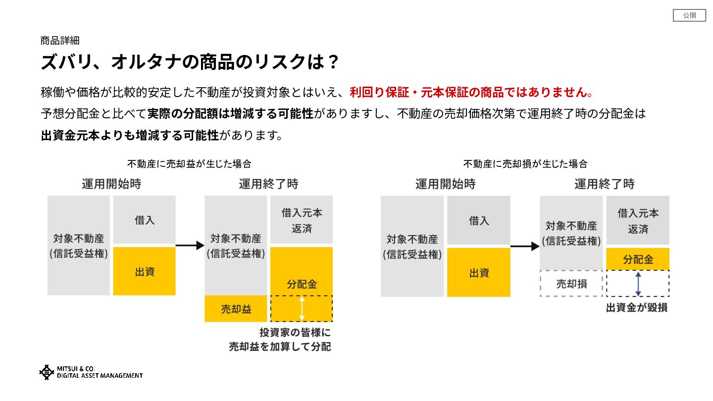 公開 商品詳細 ズバリ、オルタナの商品のリスクは? 稼働や価格が⽐較的安定した不動産が投資対象とはいえ、利回り保証‧元本保証の商品ではありません。 予想分配⾦と⽐べて実際の分配額は増減する可能性がありますし、不動産の売却価格次第で運⽤終了時の分配⾦は 出資⾦元本よりも増減する可能性があります。 不動産に売却益が生じた場合 不動産に売却損が生じた場合