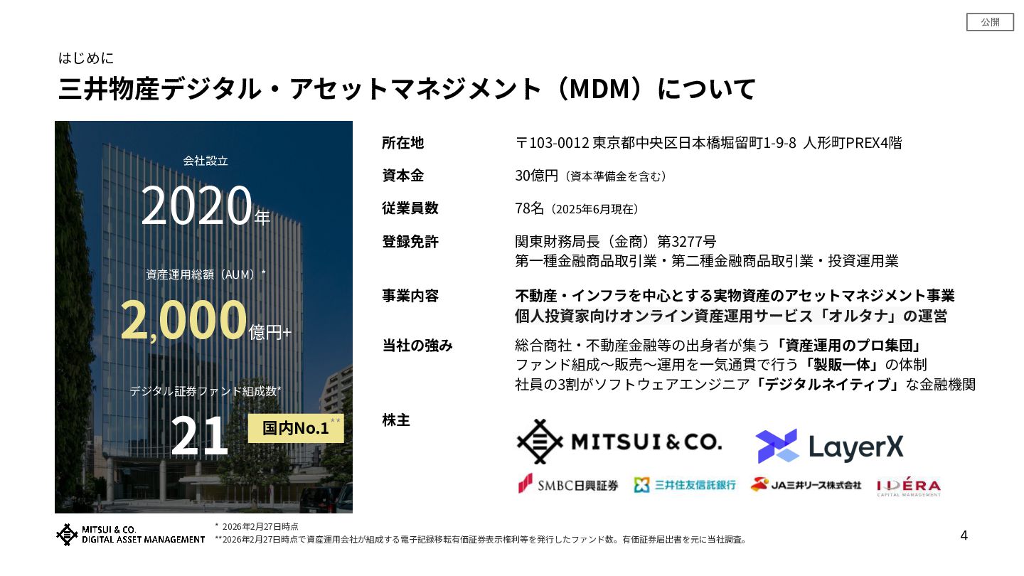 公開 三井物産デジタル‧アセットマネジメント(MDM)について はじめに 会社設⽴ 2020年 資産運⽤総額(AUM)* 2, 000億円+ デジタル証券ファンド組成数* 21