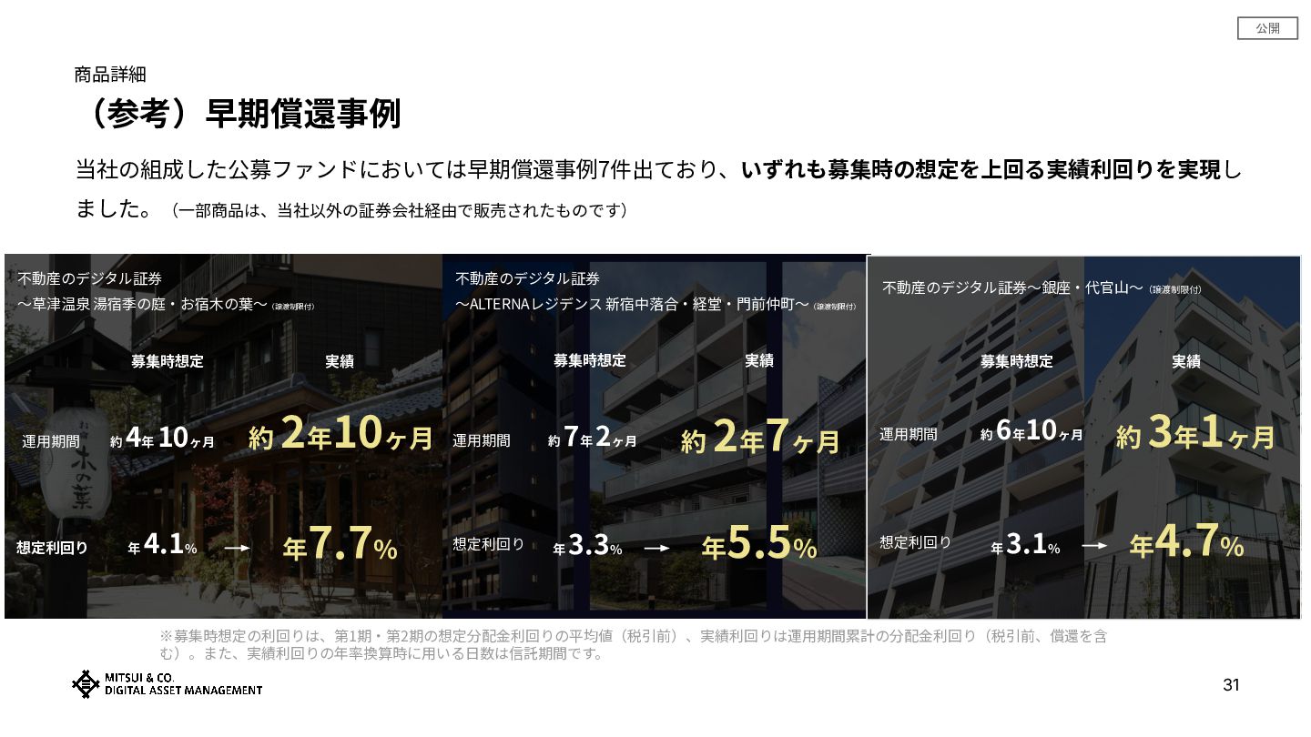 公開 商品詳細 (参考)早期償還事例 当社の組成した公募ファンドにおいては早期償還事例が7件出ており、いずれも募集時の想定を上回る実績利回りを実現 しました。(⼀部商品は、当社以外の証券会社経由で販売されたものです) ※募集時想定の利回りは、第1期‧第2期の想定分配⾦利回りの平均値(税引前)、実績利回りは運⽤期間累計の分配⾦利回り(税引前、償還を含 む)。また、実績利回りの年率換算時に⽤いる⽇数は信託期間です。 30 三井物産のデジタル証券〜横浜〜(譲渡制限付) 運⽤期間