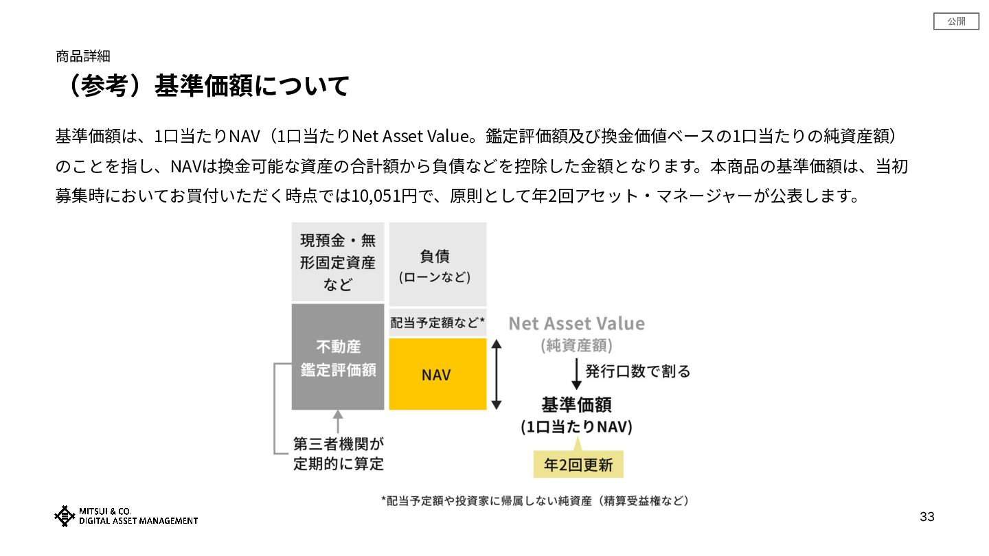 公開 33 (参考)基準価額について 商品詳細 基準価額は、1⼝当たりNAV(1⼝当たりNet Asset Value。鑑定評価額及び換⾦価値ベースの1⼝当たりの純資産額) のことを指し、NAVは換⾦可能な資産の合計額から負債などを控除した⾦額となります。本商品の基準価額は、当初 募集時においてお買付いただく時点では10,051円で、原則として年2回アセット‧マネージャーが公表します。