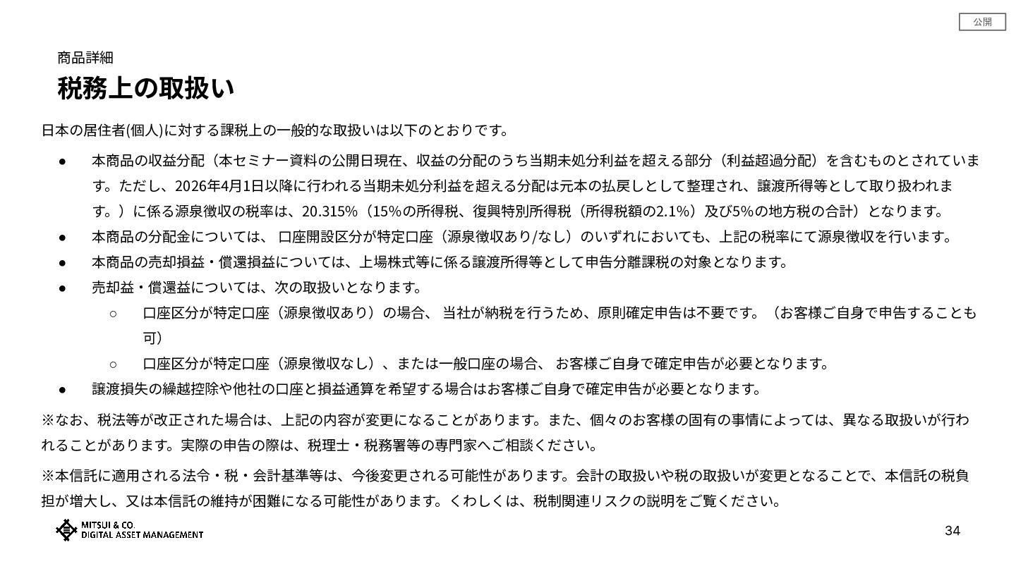 公開 • 本信託に適⽤される法令‧税‧会計基準等は、今後変更される可能性があります。会計の取扱いや税の取扱いが 変更となることで、本信託の税負担が増⼤し、⼜は本信託の維持が困難になる可能性があります。 • 2026年2⽉24⽇現在、収益の分配には当期未処分利益を超える部分(利益超過分配)を含むものとされています が、2026年4⽉1⽇以降に⾏われる当期未処分利益を超える分配は特定受益証券発⾏信託の元本の払戻しとして整 理され、譲渡所得等として取り扱われることにより、本受益権を保有する投資家への課税⽅法及び課税額が変更 されます。なお、当該取り扱いの変更に伴い、取扱⾦融商品取引業者において当該改正に対応したシステムの修 正等が必要になる可能性があり、対応が適時に⾏われない場合、本受益権を保有する投資家に事務⼿続等の負担