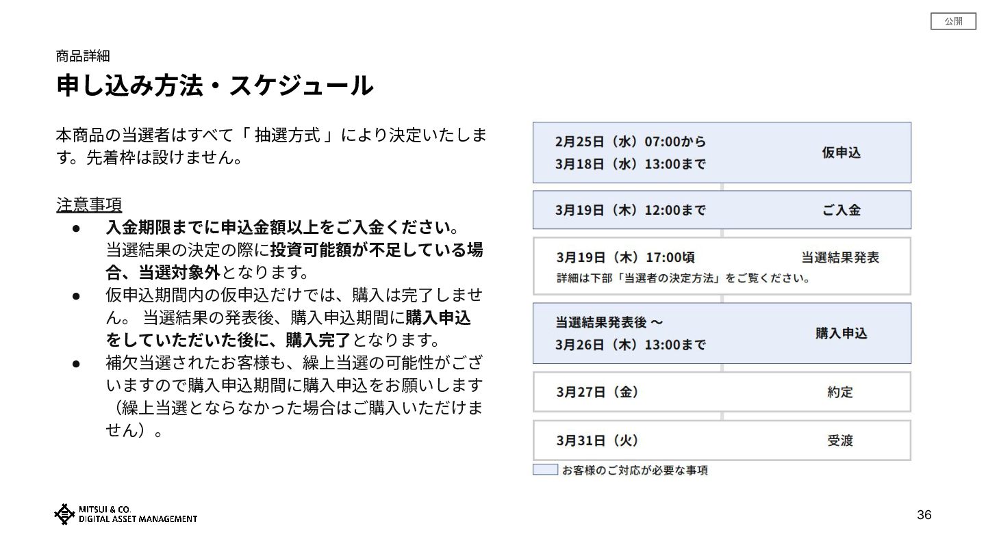 公開 申し込み⽅法‧スケジュール 注意事項 • ⼊⾦期限までに申込⾦額以上をご⼊⾦ください。 当選結果の決定の際に投資可能額が不⾜している場 合、当選対象外となります。 • 仮申込期間内の仮申込だけでは、購⼊は完了しませ ん。