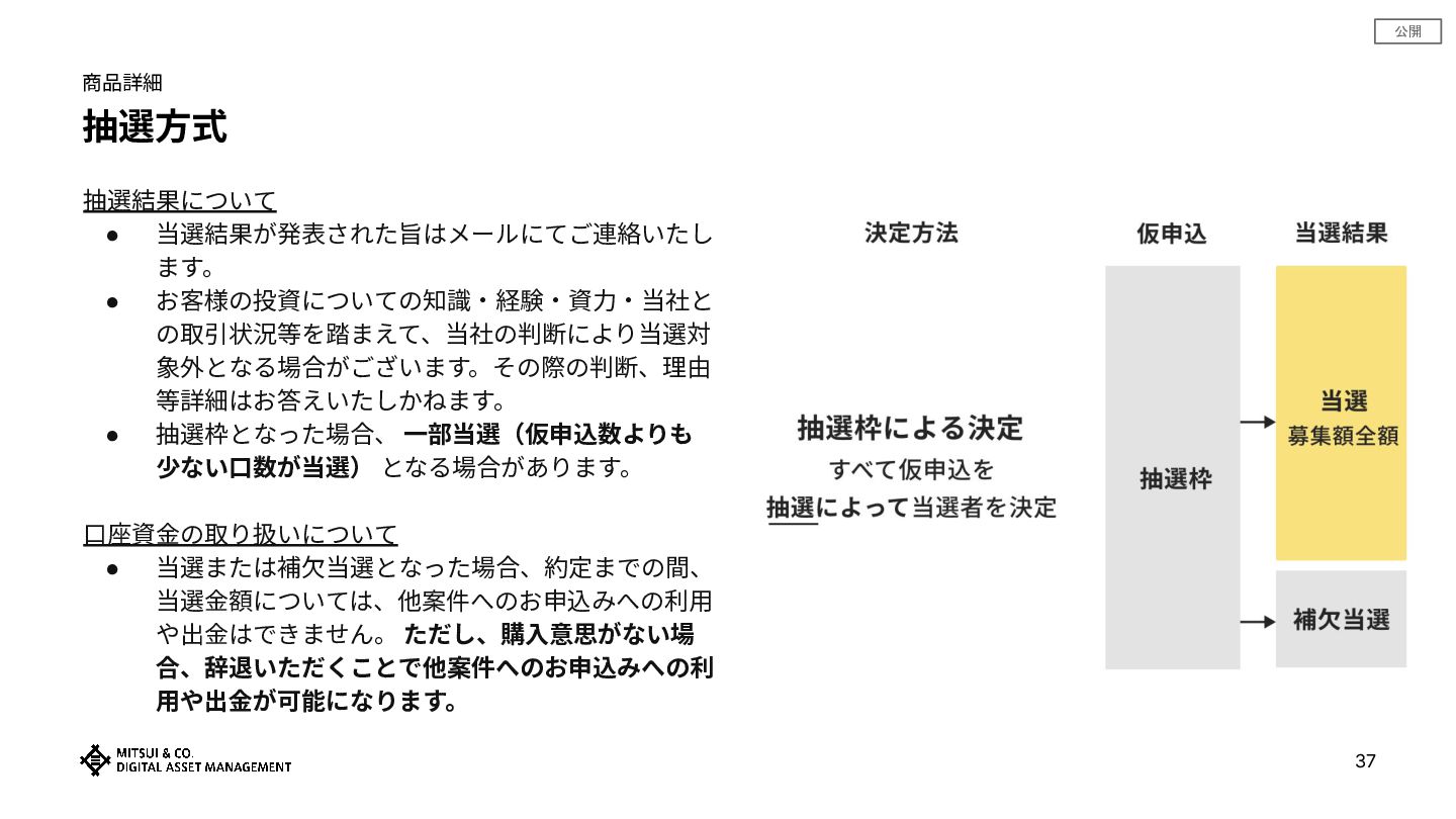 公開 抽選⽅式 抽選結果について • 当選結果が発表された旨はメールにてご連絡いたし ます。 • お客様の投資についての知識‧経験‧資⼒‧当社と の取引状況等を踏まえて、当社の判断により当選対 象外となる場合がございます。その際の判断、理由