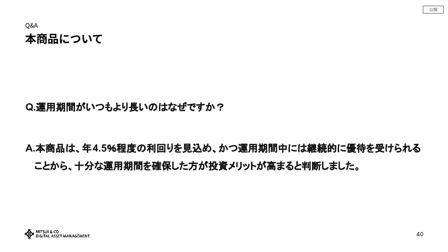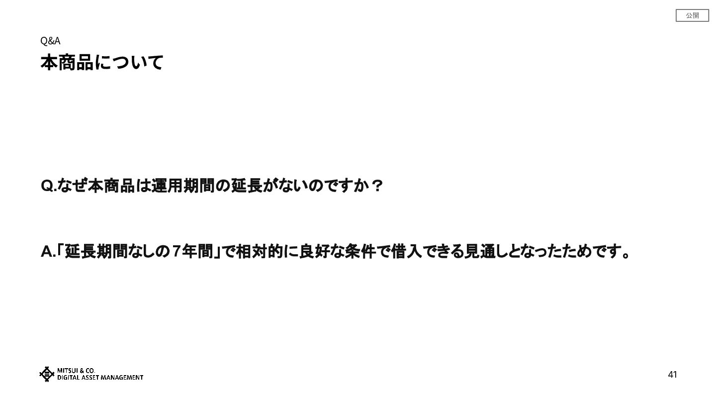 公開 Q&A 本商品について 41 Q.なぜ本商品は運用期間の延長がないのですか? A.「延長期間なしの7年間」で相対的に良好な条件で借入できる見通しとなったためです。