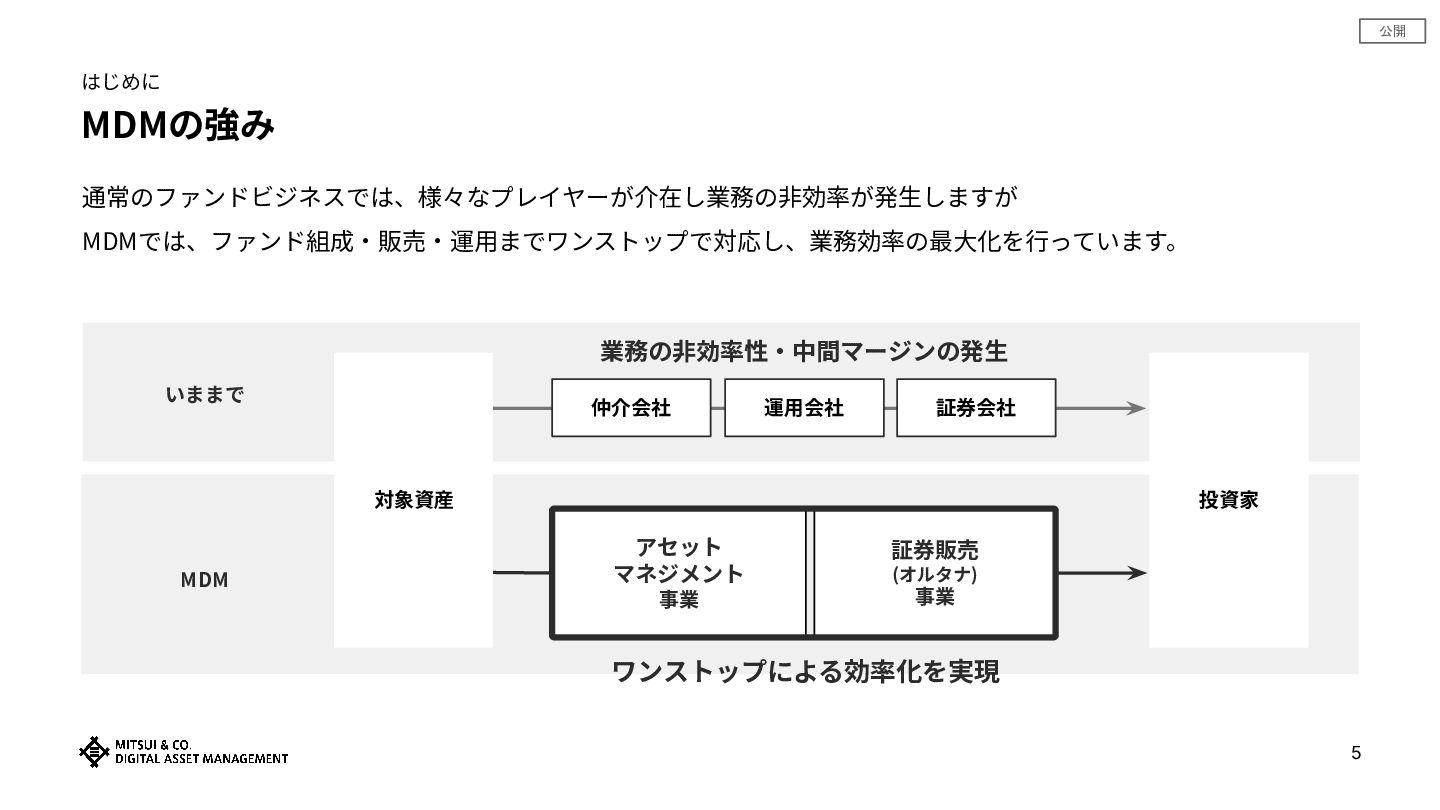 公開 MDMの強み はじめに 通常のファンドビジネスでは、様々なプレイヤーが介在し業務の⾮効率が発⽣しますが MDMでは、ファンド組成‧販売‧運⽤までワンストップで対応し、業務効率の最⼤化を⾏っています。 証券会社 運⽤会社 仲介会社 証券販売 (オルタナ)