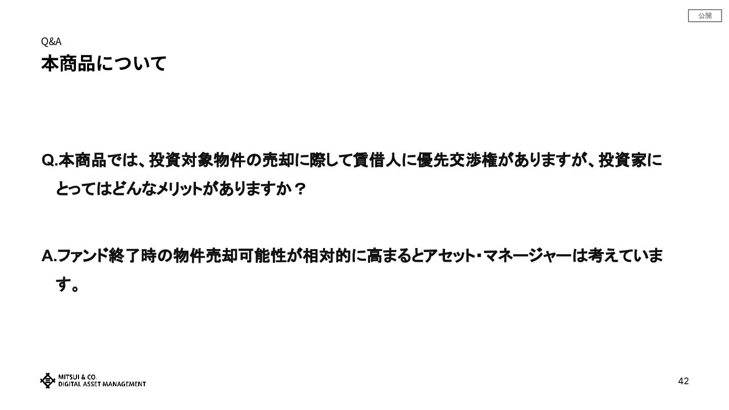 公開 Q&A 本商品について Q.本商品では、投資対象物件の売却に際して賃借人に優先交渉権がありますが、投資家に とってはどんなメリットがありますか? A.ファンド終了時の物件売却可能性が相対的に高まるとアセット・マネージャーは考えていま す。 42