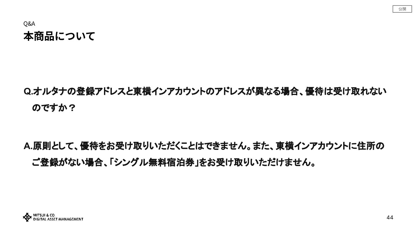 公開 Q&A 本商品について Q.オルタナの登録アドレスと東横インアカウントのアドレスが異なる場合、優待は受け取れない のですか? A.原則として、優待をお受け取りいただくことはできません。また、東横インアカウントに住所の ご登録がない場合、「シングル無料宿泊券」をお受け取りいただけません。 44