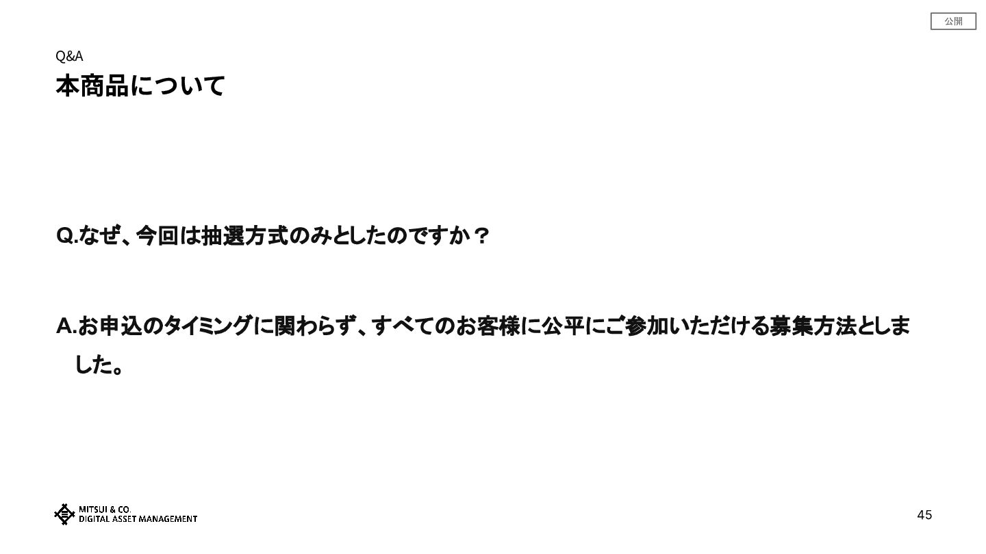 公開 Q&A 本商品について Q.なぜ、今回は抽選方式のみとしたのですか? A.お申込のタイミングに関わらず、すべてのお客様に公平にご参加いただける募集方法としま した。 45