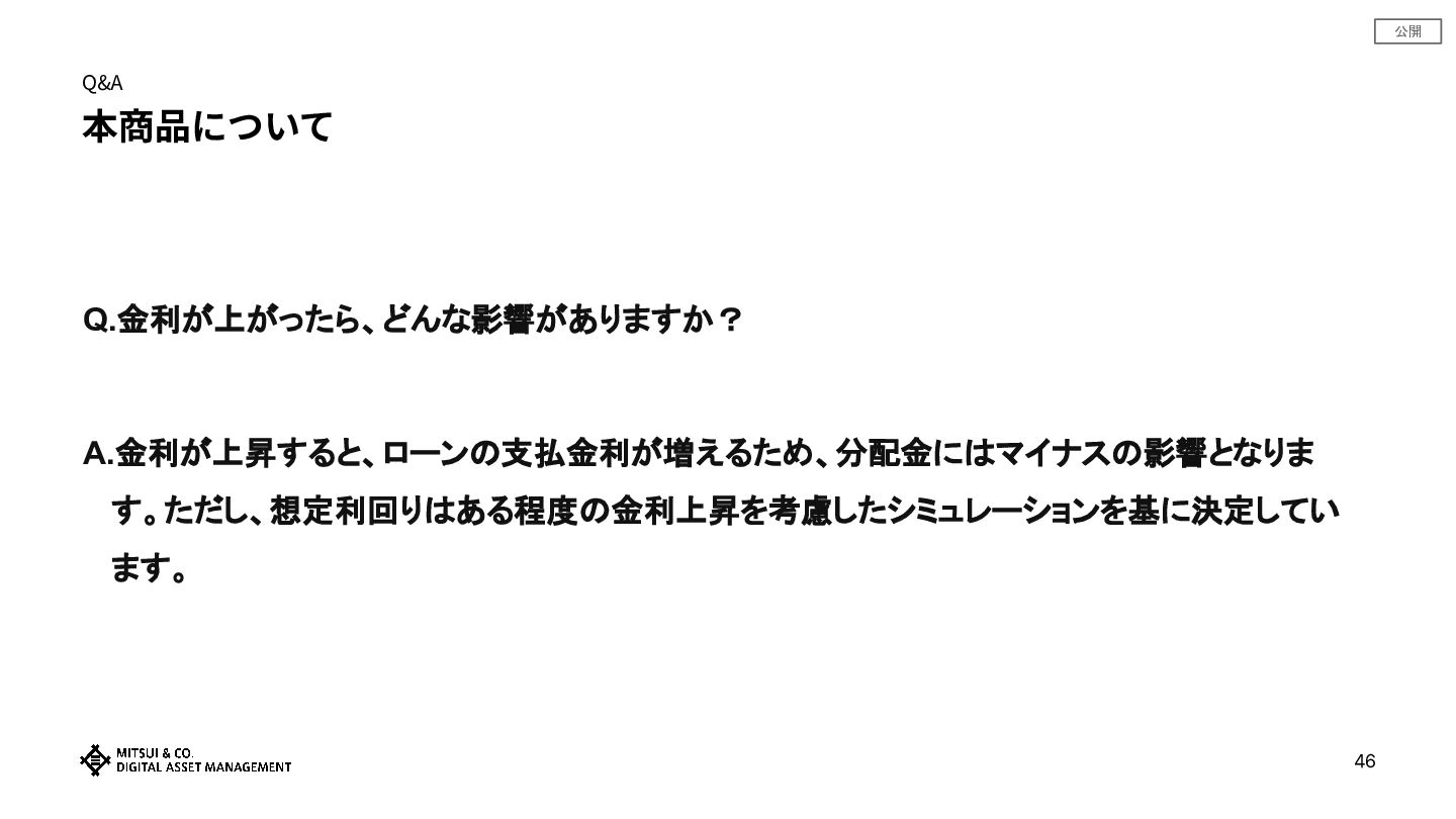 公開 Q&A 本商品について Q.金利が上がったら、どんな影響がありますか? A.金利が上昇すると、ローンの支払金利が増えるため、分配金にはマイナスの影響となりま す。ただし、想定利回りはある程度の金利上昇を考慮したシミュレーションを基に決定してい ます。 46