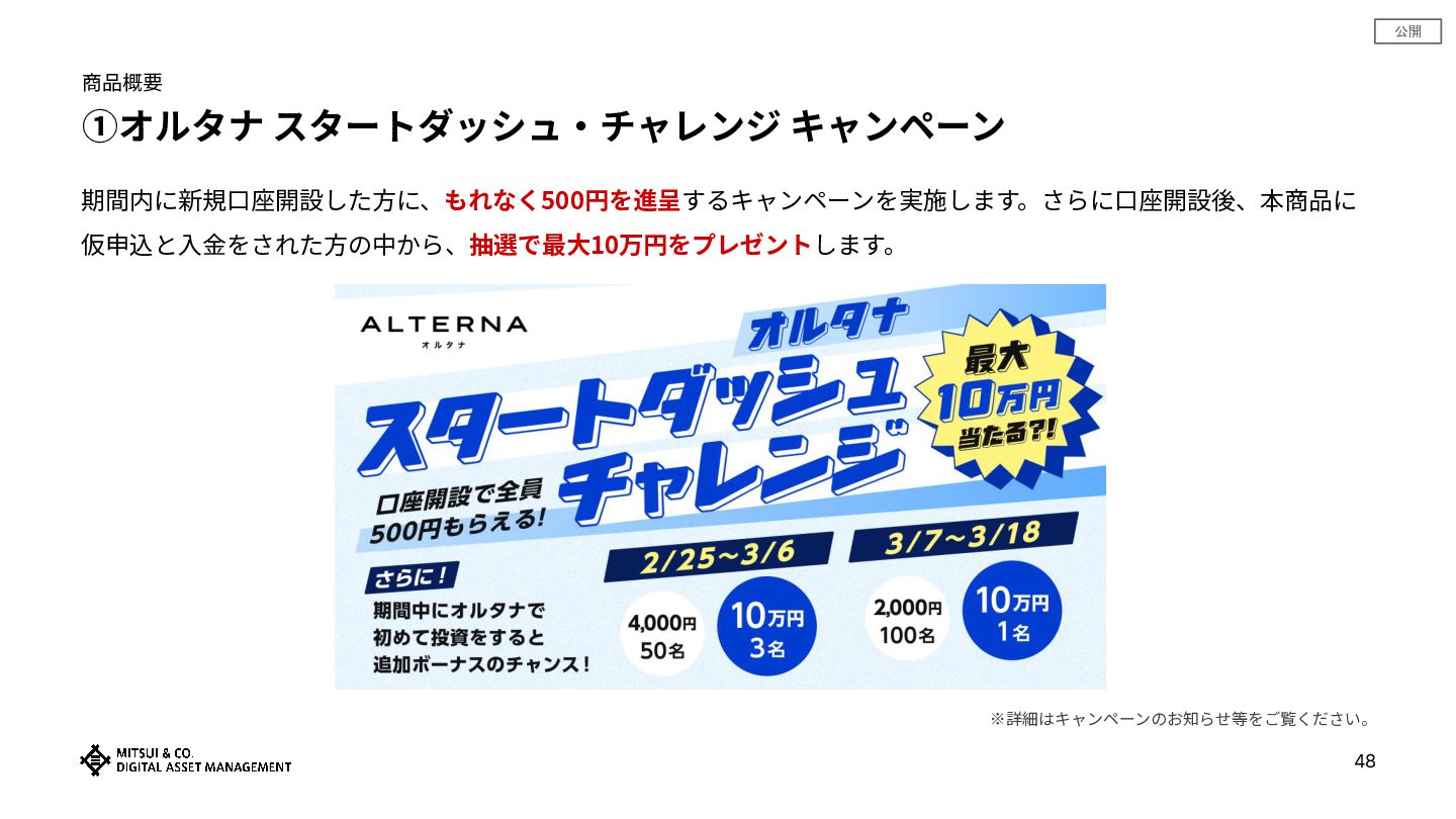 公開 商品概要 ①オルタナ スタートダッシュ‧チャレンジ キャンペーン 48 期間内に新規⼝座開設した⽅に、もれなく500円を進呈するキャンペーンを実施します。さらに⼝座開設後、本商品に 仮申込と⼊⾦をされた⽅の中から、抽選で最⼤10万円をプレゼントします。 ※詳細はキャンペーンのお知らせ等をご覧ください。