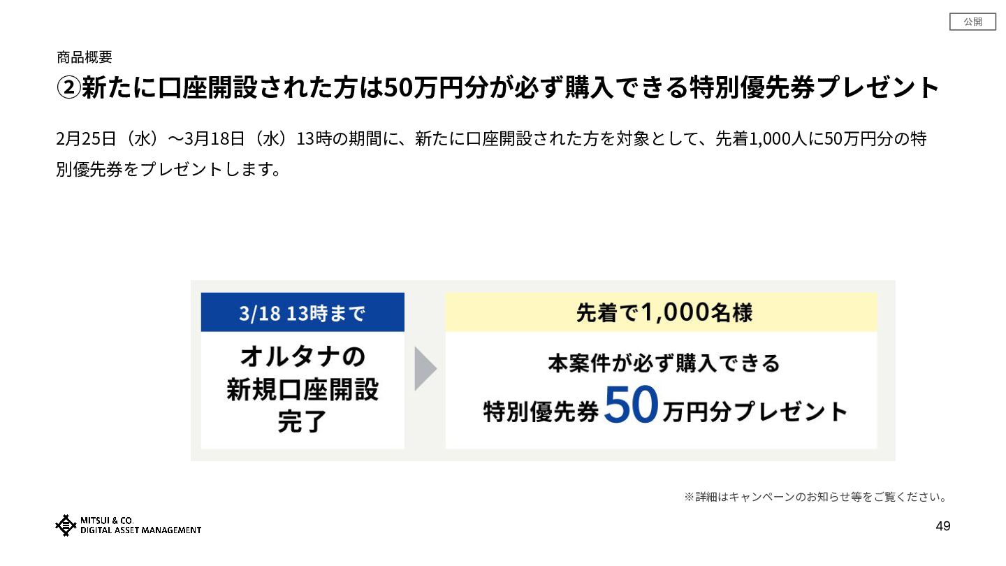 公開 商品概要 ②新たに⼝座開設された⽅は50万円分が必ず購⼊できる特別優先券プレゼント 49 2⽉25⽇(⽔)〜3⽉18⽇(⽔)13時の期間に、新たに⼝座開設された⽅を対象として、先着1,000⼈に50万円分の特 別優先券をプレゼントします。 ※詳細はキャンペーンのお知らせ等をご覧ください。