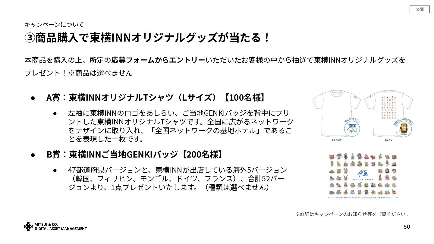 公開 ③商品購⼊で東横INNオリジナルグッズが当たる! • A賞:東横INNオリジナルTシャツ(Lサイズ)【100名様】 • 左袖に東横INNのロゴをあしらい、ご当地GENKIバッジを背中にプリ ントした東横INNオリジナルTシャツです。全国に広がるネットワーク をデザインに取り⼊れ、「全国ネットワークの基地ホテル」であるこ とを表現した⼀枚です。 •