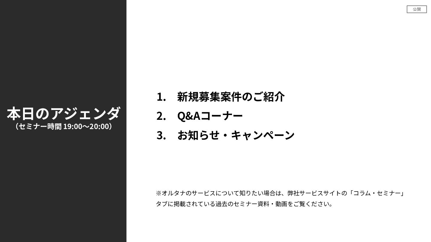 公開 1. 新規募集案件のご紹介 2. Q&Aコーナー 3. お知らせ‧キャンペーン 本⽇のアジェンダ (セミナー時間 19:00〜20:00)