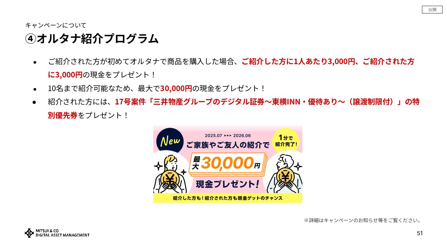 公開 ④オルタナ紹介プログラム • ご紹介された⽅が初めてオルタナで商品を購⼊した場合、ご紹介した⽅に1⼈あたり3,000円、ご紹介された⽅ に3,000円の現⾦をプレゼント! • 10名まで紹介可能なため、最⼤で30,000円の現⾦をプレゼント! • 紹介された⽅には、17号案件「三井物産グループのデジタル証券〜東横INN‧優待あり〜(譲渡制限付)」の特 別優先券をプレゼント!