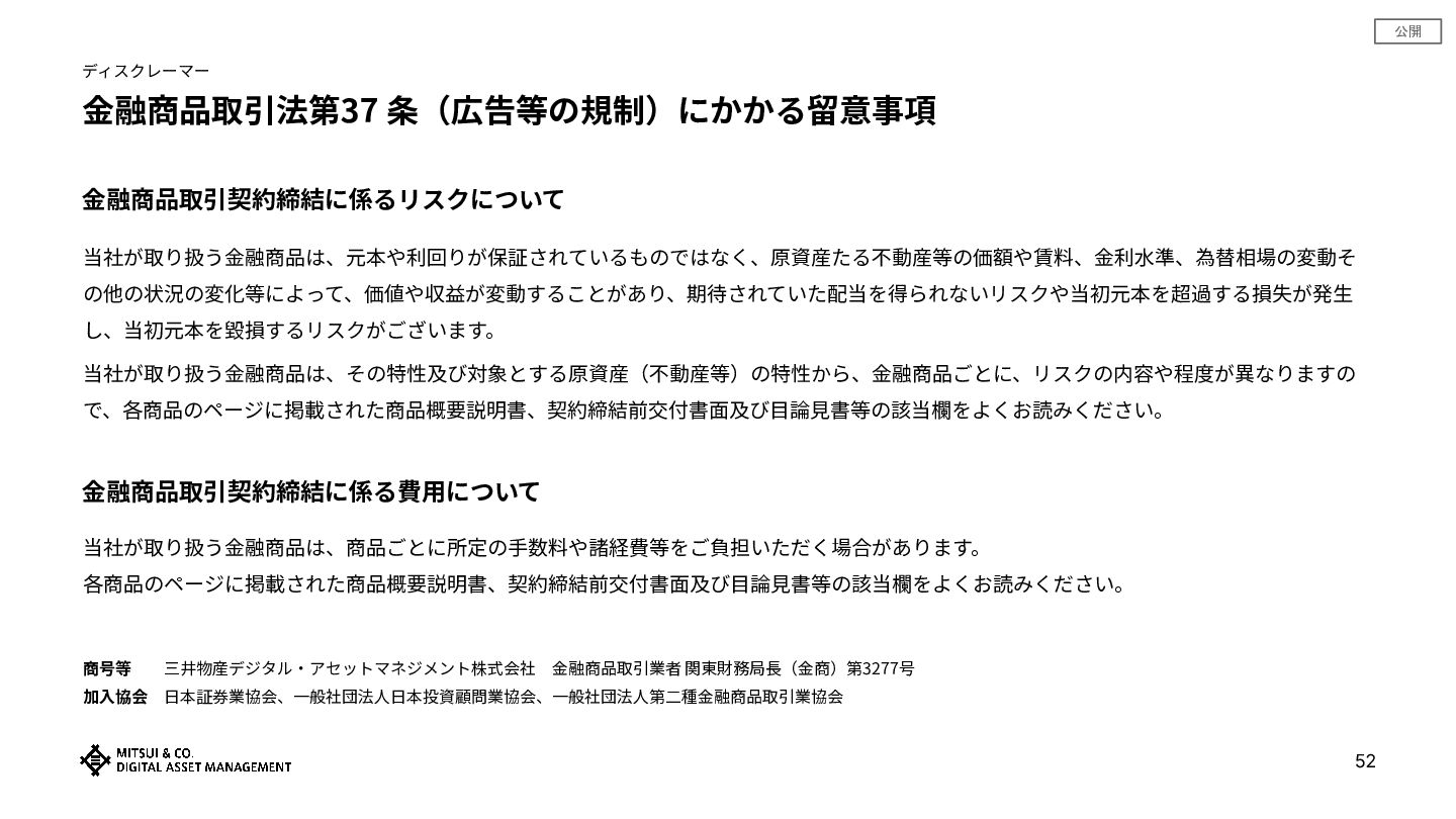 公開 52 ディスクレーマー ⾦融商品取引法第37 条(広告等の規制)にかかる留意事項 ⾦融商品取引契約締結に係るリスクについて 当社が取り扱う⾦融商品は、元本や利回りが保証されているものではなく、原資産たる不動産等の価額や賃料、⾦利⽔準、為替相場の変動そ の他の状況の変化等によって、価値や収益が変動することがあり、期待されていた配当を得られないリスクや当初元本を超過する損失が発⽣ し、当初元本を毀損するリスクがございます。 当社が取り扱う⾦融商品は、その特性及び対象とする原資産(不動産等)の特性から、⾦融商品ごとに、リスクの内容や程度が異なりますの