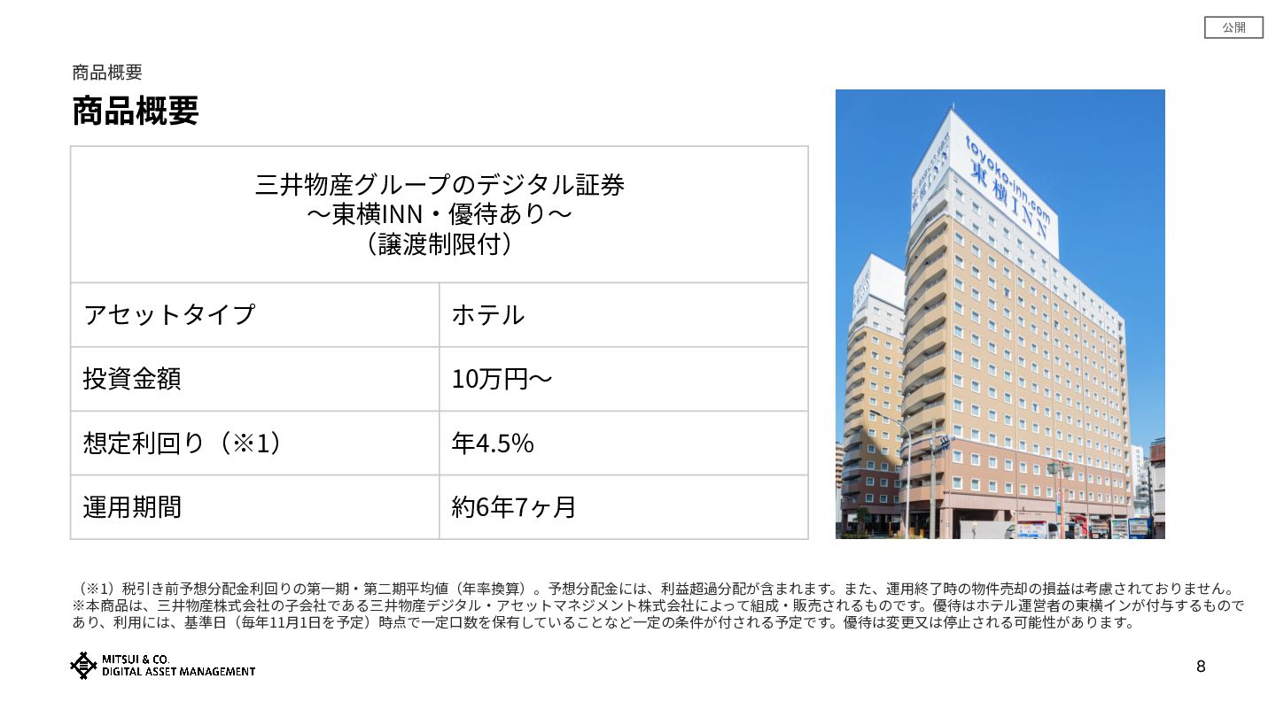 公開 8 商品概要 商品概要 三井物産グループのデジタル証券 〜東横INN‧優待あり〜 (譲渡制限付) アセットタイプ ホテル 投資⾦額