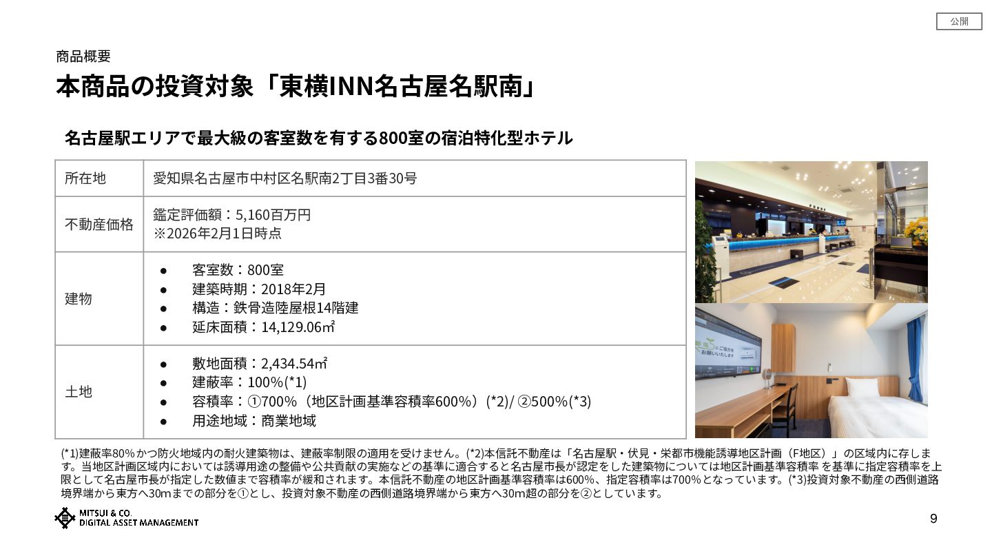 公開 商品概要 本商品の投資対象「東横INN名古屋名駅南」 9 所在地 愛知県名古屋市中村区名駅南2丁⽬3番30号 不動産価格 鑑定評価額:5,160百万円 ※2026年2⽉1⽇時点 建物