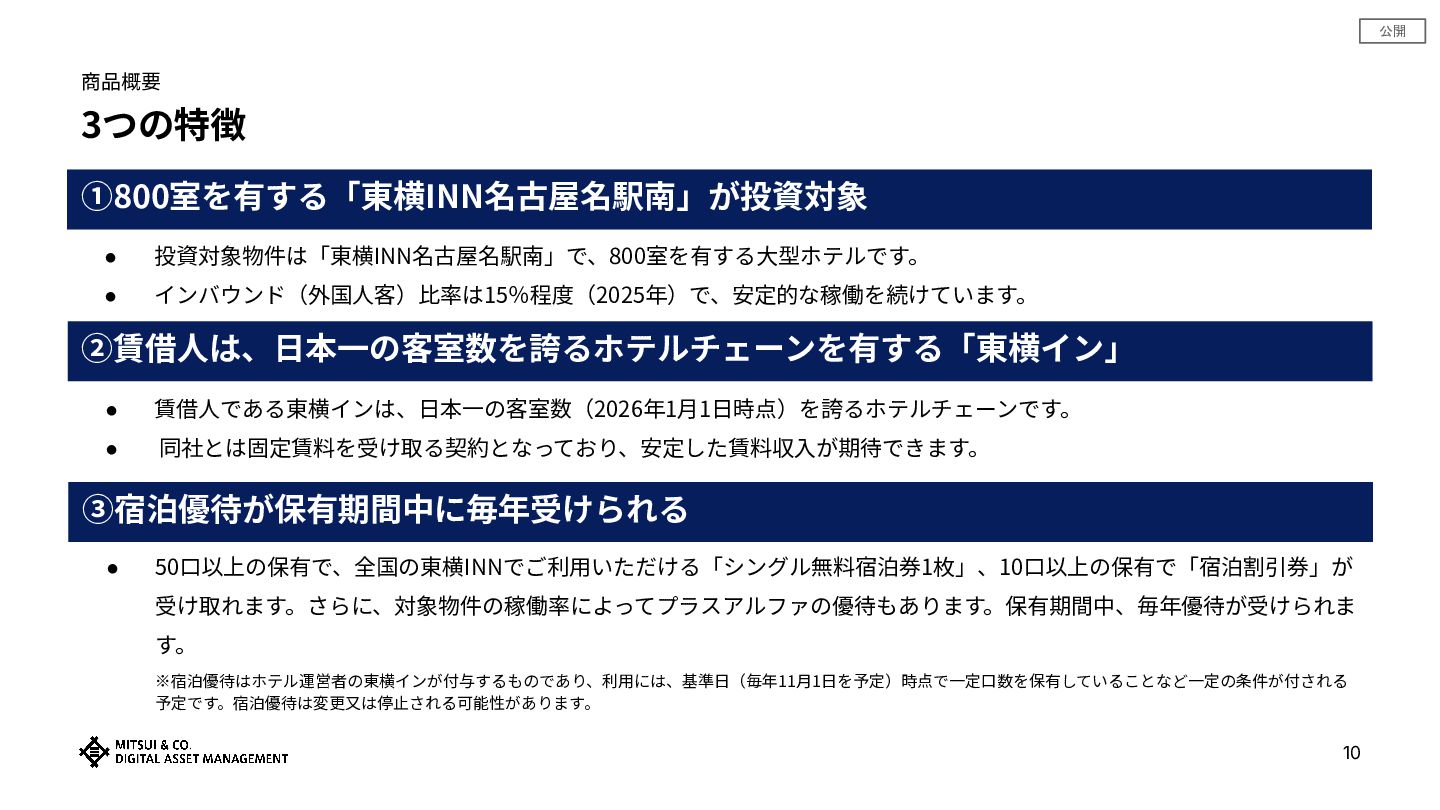 10万円〜 想定利回り(※1) 年4.5% 運⽤期間 約6年7ヶ⽉ (※1)税引き前予想分配⾦利回りの第⼀期‧第⼆期平均値(年率換算)。予想分配⾦には、利益超過分配が含まれます。また、運⽤終了時の物件売却の損益は考慮されておりません。 ※本商品は、三井物産株式会社の⼦会社である三井物産デジタル‧アセットマネジメント株式会社によって組成‧販売されるものです。優待はホテル運営者の東横インが付与するもので あり、利⽤には、基準⽇(毎年11⽉1⽇を予定)時点で⼀定⼝数を保有していることなど⼀定の条件が付される予定です。優待は変更⼜は停⽌される可能性があります。