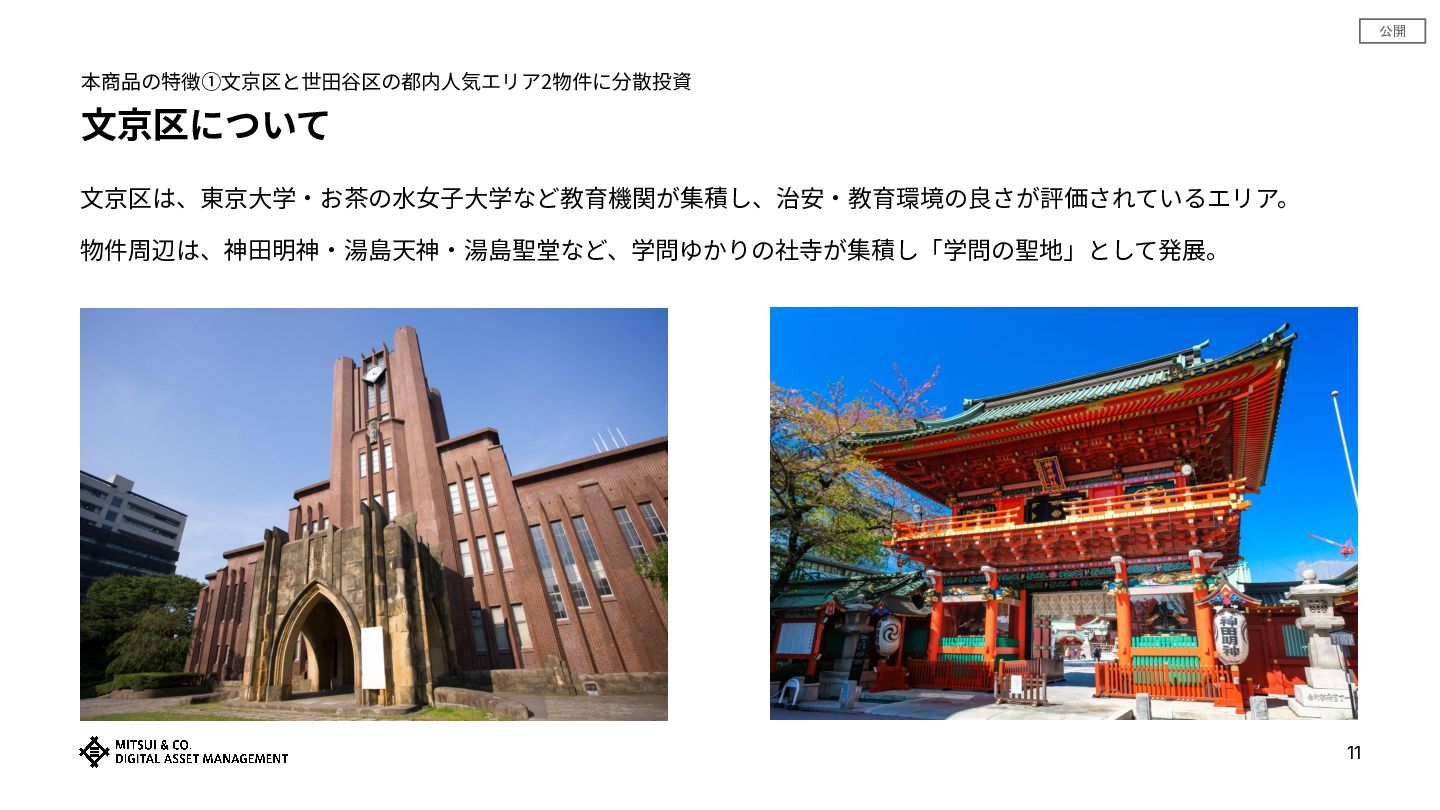 公開 本商品の特徴①⽂京区と世⽥⾕区の都内⼈気エリア2物件に分散投資 ⽂京区について 11 ⽂京区は、東京⼤学‧お茶の⽔⼥⼦⼤学など教育機関が集積し、治安‧教育環境の良さが評価されているエリア。 物件周辺は、神⽥明神‧湯島天神‧湯島聖堂など、学問ゆかりの社寺が集積し「学問の聖地」として発展。