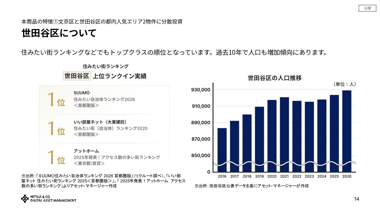 公開 13 世⽥⾕は、緑の多い住環境と都市機能のバランスに優れ、⽇常の利便性を保ちながら落ち着いた暮らしを実現できる エリアです。公園‧教育環境‧⽣活利便施設がまとまり、DINKS〜プレファミリー層を中⼼に⻑期の賃貸需要が⾒込 みやすい⽴地です。 本商品の特徴①⽂京区と世⽥⾕区の都内⼈気エリア2物件に分散投資 世⽥⾕区について