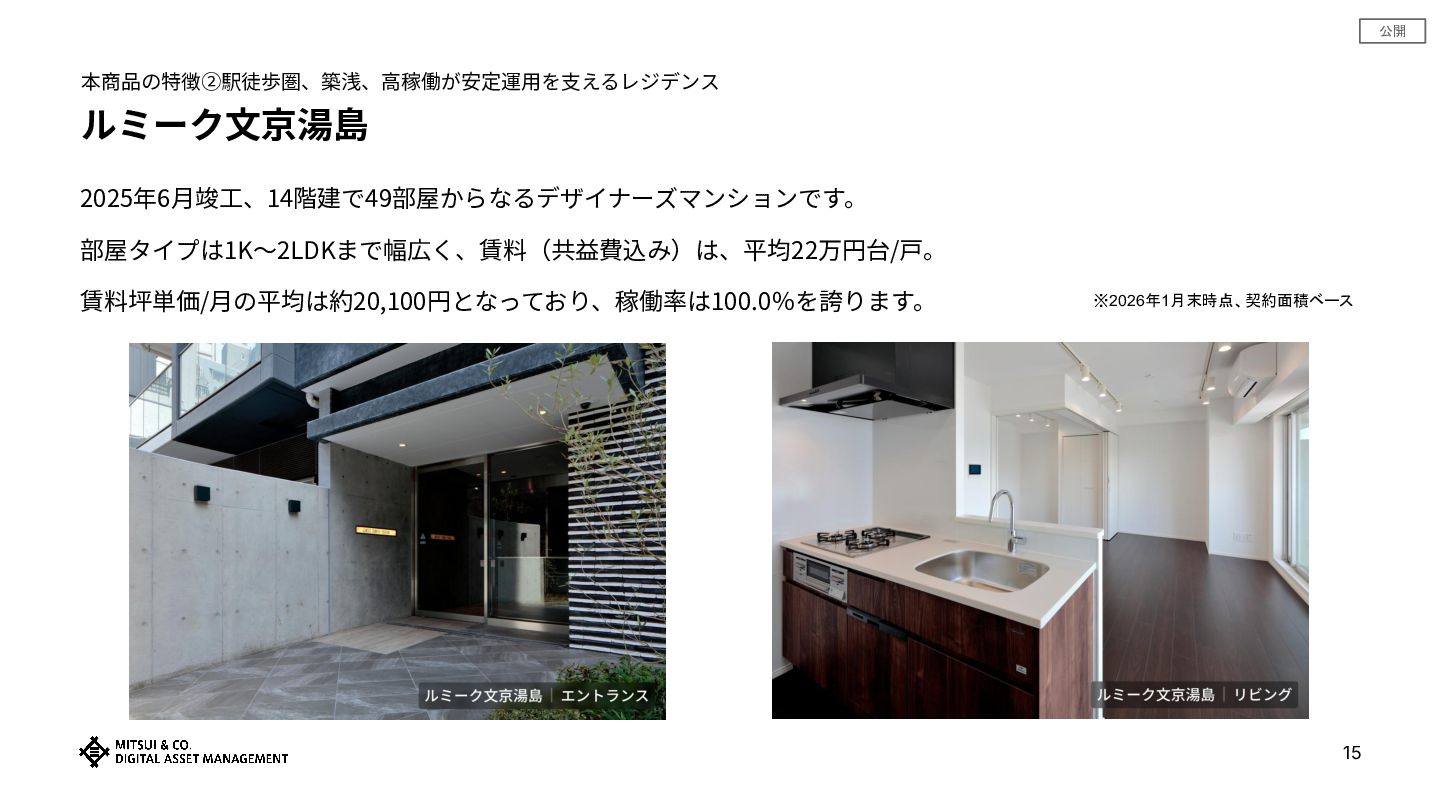 公開 本商品の特徴②駅徒歩圏、築浅、⾼稼働が安定運⽤を⽀えるレジデンス ルミーク⽂京湯島 15 2025年6⽉竣⼯、14階建で49部屋からなるデザイナーズマンションです。 部屋タイプは1K〜2LDKまで幅広く、賃料(共益費込み)は、平均22万円台/⼾。 賃料坪単価/⽉の平均は約20,100円となっており、稼働率は100.0%を誇ります。 ※2026年1月末時点、契約面積ベース
