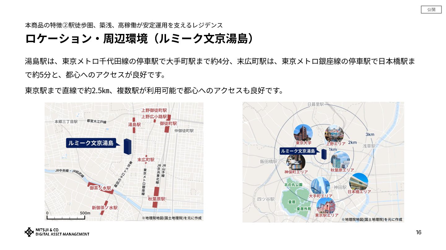 公開 本商品の特徴②駅徒歩圏、築浅、⾼稼働が安定運⽤を⽀えるレジデンス ロケーション‧周辺環境(ルミーク⽂京湯島) 16 湯島駅は、東京メトロ千代⽥線の停⾞駅で⼤⼿町駅まで約4分、末広町駅は、東京メトロ銀座線の停⾞駅で⽇本橋駅ま で約5分と、都⼼へのアクセスが良好です。 東京駅まで直線で約2.5㎞、複数駅が利⽤可能で都⼼へのアクセスも良好です。