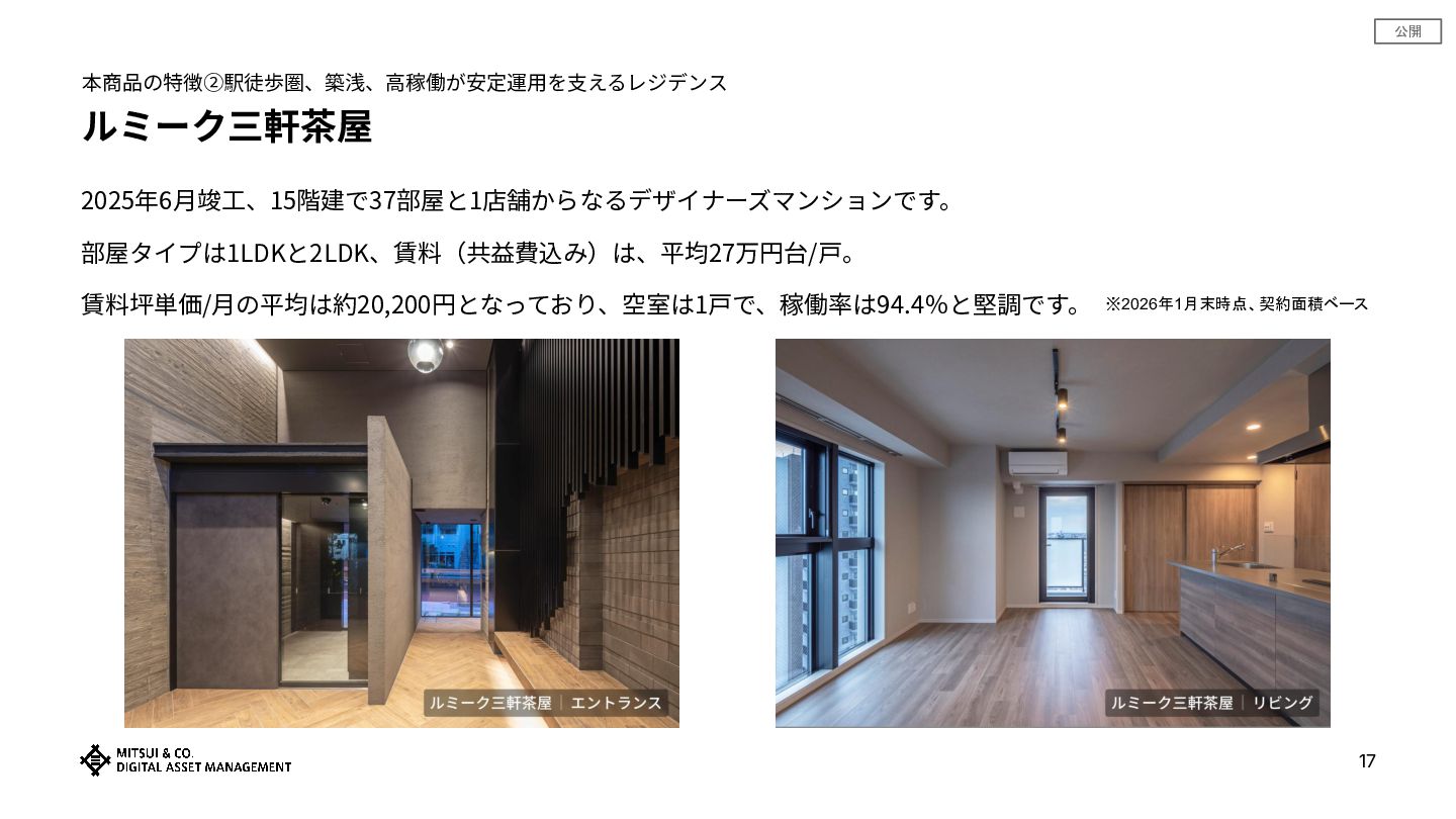 公開 本商品の特徴②駅徒歩圏、築浅、⾼稼働が安定運⽤を⽀えるレジデンス ルミーク三軒茶屋 17 2025年6⽉竣⼯、15階建で37部屋と1店舗からなるデザイナーズマンションです。 部屋タイプは1LDKと2LDK、賃料(共益費込み)は、平均27万円台/⼾。 賃料坪単価/⽉の平均は約20,200円となっており、空室は1⼾で、稼働率は94.4%と堅調です。 ※2026年1月末時点、契約面積ベース