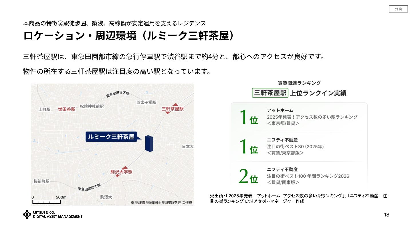 公開 本商品の特徴②駅徒歩圏、築浅、⾼稼働が安定運⽤を⽀えるレジデンス ロケーション‧周辺環境(ルミーク三軒茶屋) 18 三軒茶屋駅は、東急⽥園都市線の急⾏停⾞駅で渋⾕駅まで約4分と、都⼼へのアクセスが良好です。 物件の所在する三軒茶屋駅は注⽬度の⾼い駅となっています。 ※出所:「2025年発表!アットホーム アクセス数の多い駅ランキング」、「ニフティ不動産 注 目の街ランキング」よりアセット・マネージャー作成