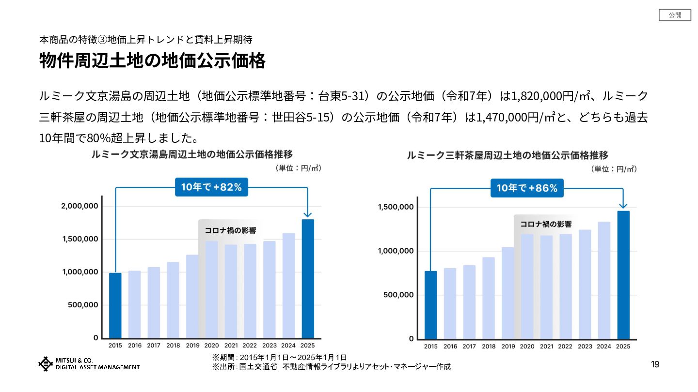 ②駅徒歩圏、築浅、⾼稼働が安定運⽤を⽀えるレジデンス • 駅徒歩圏の利便性に加え、2025年竣⼯の築浅レジデンス。稼働率はルミーク⽂京湯島が100%、ルミーク三軒茶屋が 94.4%と⾜元は堅調で、合計86⼾+1店舗の分散効果も享受できます。 ※2026年1⽉末時点、契約⾯積ベース • 両エリアとも過去10年間で地価が80%超上昇しており、賃料の上昇も⾒込まれるものとアセット‧マネージャーは考えて います。