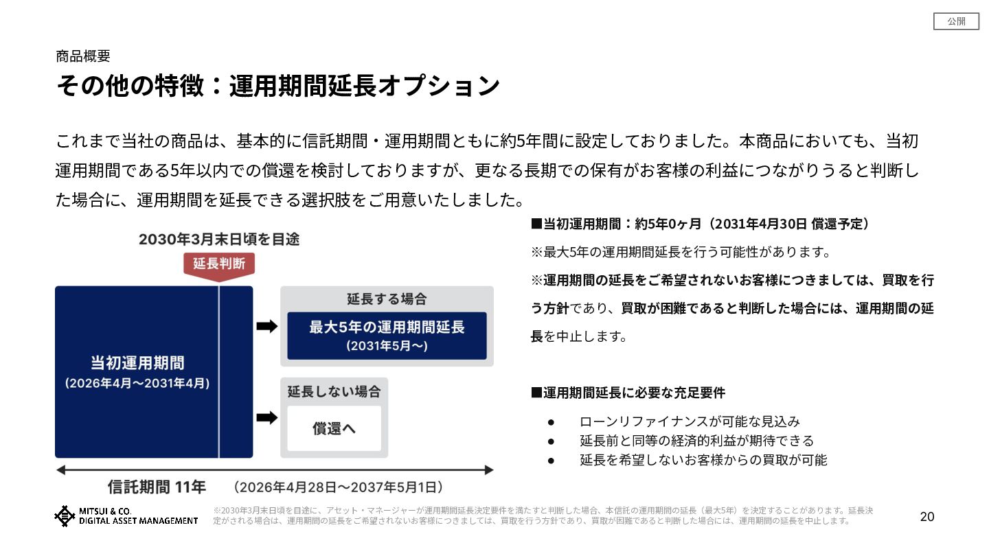 公開 商品概要 その他の特徴:運⽤期間延⻑オプション 20 これまで当社の商品は、基本的に信託期間‧運⽤期間ともに約5年間に設定しておりました。本商品においても、当初 運⽤期間である5年以内での償還を検討しておりますが、更なる⻑期での保有がお客様の利益につながりうると判断し た場合に、運⽤期間を延⻑できる選択肢をご⽤意いたしました。 ※2030年3⽉末⽇頃を⽬途に、アセット‧マネージャーが運⽤期間延⻑決定要件を満たすと判断した場合、本信託の運⽤期間の延⻑(最⼤5年)を決定することがあります。延⻑決 定がされる場合は、運⽤期間の延⻑をご希望されないお客様につきましては、買取を⾏う⽅針であり、買取が困難であると判断した場合には、運⽤期間の延⻑を中⽌します。 ▪当初運⽤期間:約5年0ヶ⽉(2031年4⽉30⽇