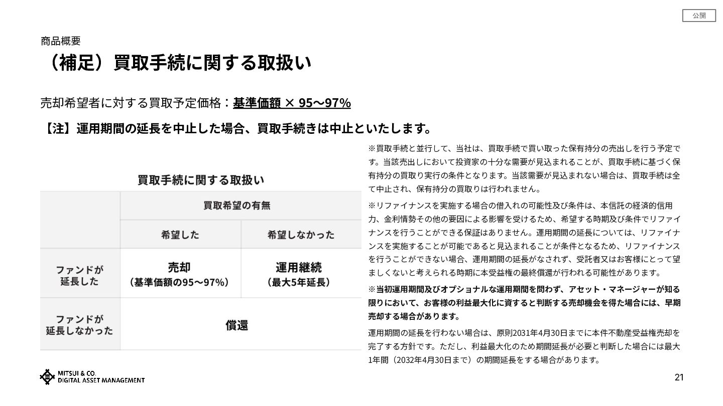 公開 商品概要 (補⾜)買取⼿続に関する取扱い 21 ※買取⼿続と並⾏して、当社は、買取⼿続で買い取った保有持分の売出しを⾏う予定で す。当該売出しにおいて投資家の⼗分な需要が⾒込まれることが、買取⼿続に基づく保 有持分の買取り実⾏の条件となります。当該需要が⾒込まれない場合は、買取⼿続は全 て中⽌され、保有持分の買取りは⾏われません。 ※リファイナンスを実施する場合の借⼊れの可能性及び条件は、本信託の経済的信⽤ ⼒、⾦利情勢その他の要因による影響を受けるため、希望する時期及び条件でリファイ
