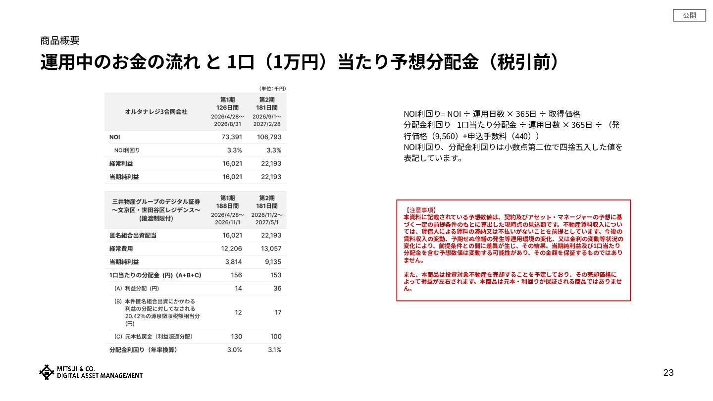 365⽇ ÷ 取得価格 分配⾦利回り= 1⼝当たり分配⾦ ÷ 運⽤⽇数 × 365⽇ ÷ (発 ⾏価格(9,560)+申込⼿数料(440)) NOI利回り、分配⾦利回りは⼩数点第⼆位で四捨五⼊した値を 表記しています。 【注意事項】 本資料に記載されている予想数値は、契約及びアセット‧マネージャーの予想に基 づく⼀定の前提条件のもとに算出した現時点の⾒込額です。不動産賃料収⼊につい ては、賃借⼈による賃料の滞納⼜は不払いがないことを前提としています。今後の 賃料収⼊の変動、予期せぬ修繕の発⽣等運⽤環境の変化、⼜は⾦利の変動等状況の 変化により、前提条件との間に差異が⽣じ、その結果、当期純利益及び1⼝当たり 分配⾦を含む予想数値は変動する可能性があり、その⾦額を保証するものではあり ません。 また、本商品は投資対象不動産を売却することを予定しており、その売却価格に よって損益が左右されます。本商品は元本‧利回りが保証される商品ではありませ ん。 23